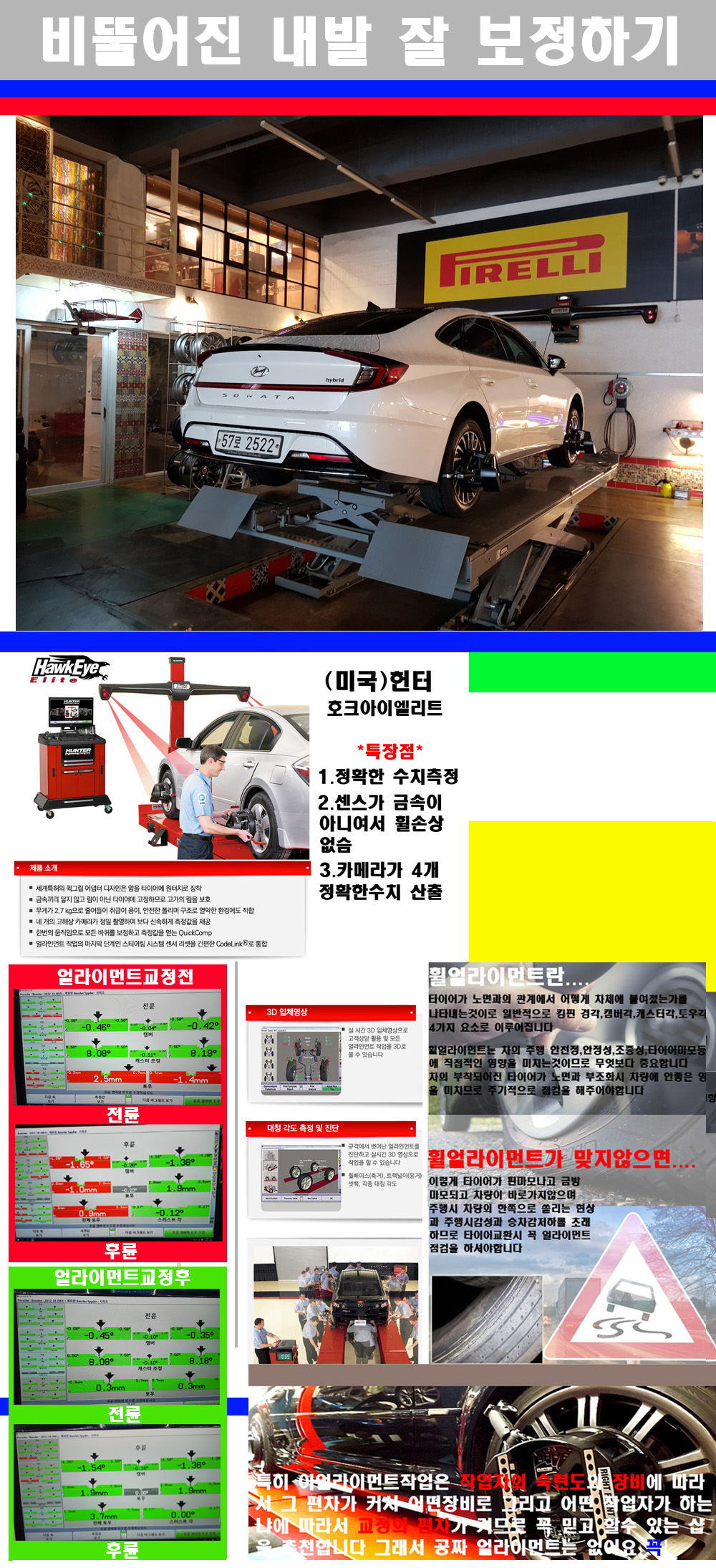 이후 미국 헌터사 호크아이엘리트 장비로 3D얼라이먼트를 진행했습니다 이장비는 현존하는 가장 진화된 얼라이먼트장비입니다 특히 4개의 고성능카메라가 장착되어져 있어 실시간으로 오차가 없는 측정값을 구현하며 바퀴당 각 휠센서 클램프가 프라스틱이며 타이어바닦면을 지지하는 방식이여서 휠의 손상이 없는것이 특징입니다 하지만 장비보다 차량의 얼라이먼트를 볼시 작업자의 정성과 그리고 능력과 숙련도가 관견이기에 꼭 휠얼라이먼트를 장사수단으로 하지않는 샵을 권장합니다 자사는 얼라이먼트정렬시 교정전 교정후를 구분하여 고객님께 직접 이수치값을 확인시켜드리고 작업을 하며 이후 각각의 특성을 가진 타이어들에 대해서 설명 및 관리요령 운전요령 같이 설명해드리고 있습니다 이후 타이어와 휠의 정확한 발란스값과 진동값을 보정후 헌터사 호크아이엘리트 3D얼라이먼트장비로 공장에서 처음 출고될시의 팩토리값으로 교정하였습니다 그리고 타이어질소가스주입기로 3번정도 진공상태로 만든후 질소가스를 주입했습니다 질소가스주입시 가장 관견은 순도이기에 이런 여러번의 진공상태후 주입하고 빼주는 과정를 많이 해주어야합니다 질소가스의 주입시 타이어공기압의 저하가 덜하고 화합물질이 반응을 하지않아 소음전파력과 그리고 타이어안쪽에 수분을 발생하지않으며 타이어안쪽에서의 공기압이 팽창하지않아 타이어에 스트레스를 덜주게 됩니다 하지만 이부분도 공기속에 질소가 80%정도 존재하기에 미미한 차이이지만 질소순도를 높이고 주행시 좋은 점이 확연히 많기에 질소주입을 해드리고 있습니다 특히 고성능타이어나 하중값을 많이 주는 타이어일경우에는 위에서 언급한 부분에서 많이 차이를 보이고 있습니다 이후 타이어왁싱후 출고했습니다+ 감사합니다 [2155517]소나타 피렐리타이어 피제로 올시즌 (순정품) 215/55R17