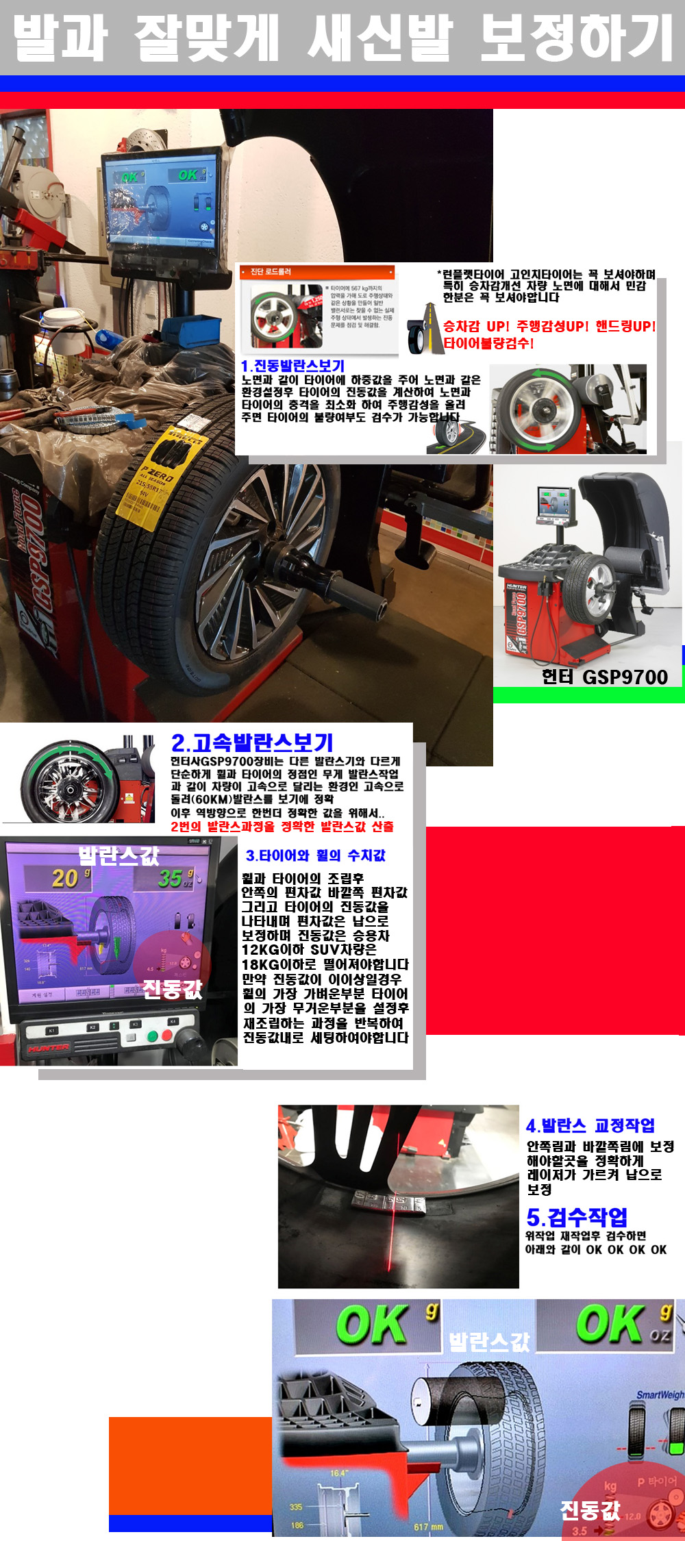 이후 미국 헌터사 GSP9700장비로 고속 및 진동발란스로 더욱더 작업의 정확도와 정밀도를 높였습니다 이장비는 노면에서 올라오는 진동값까지 계산하여 발란스값을 보는 방식으로 진동발란스기는 헌터사GSP9700장비가 유일합니다 이후 역방향으로 60키로의 고속으로 다시 발란스값을 보정하는 방식입니다 그래서 노면에서 올라오는 진동를 잡을수 있으며 특히 타이어의 노면력 측정으로 타이어의 불량여부까지도 검수가 가능한 장비입니다 특히 고속발란스 측정시 타사 발란스기와 틀리게 고속으로 발란스를 보기에 차량이 고속으로 달리는 시뮤레이션 구현이 가능하여 정확한 발란스값을 볼수가 있습니다 그리고 작업자에게는 불필요한 발란스납을 붙이지 않아 미관상으로 좋고 납을 절약하는 고객님에게도윈이고 작업자에게도 윈윈할수 있는 장비입니다 그리고 시중에서 고속진동발란스라고 말하시는 샵들이 많은데 꼭아셔야하는것은 고속발란스는 말그대로 발란스를 볼때 고속으로 돌리기에 60키로 전후 그리고 진동값을 계산하기위해서는 발란스기에 진동롤러가 있어야합니다 그래서 미국헌터사 GSP9700장비가 유일합니다 다른 샵에서 말하는 발란스기는 고속진동발란스기능없는 일반발란스 기기입니다 이점 꼭 아시고 장착하시기를 바랍니다