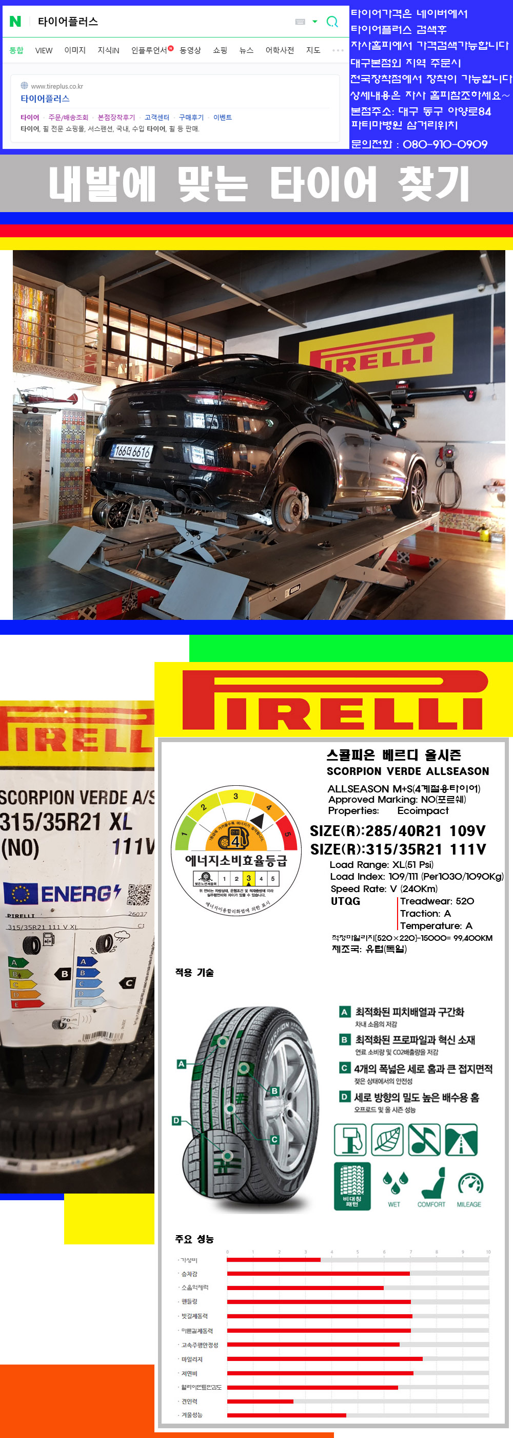 ♥♥♥본점 대구 동구 아양로84 (파티마삼거리 위치) 국산 수입타이어 할인행사중♥♥♥ 타이어플러스 대구본점은 전국에서 가장 규모가 큰매장입니다 물론 자사는 지하층 지상4층건물이며 1층작업장이외는 모두 창고로 사용중인 회사입니다 대구광역시 동구 아양로84(파티마병원 네거리에 위치)그래서 매장으로 바로 오시면 당일에 바로 장착이 가능합니다 물론 한국 금호 넥센 브리지스톤 미쉐린 콘티넨탈 피렐리 던롭 굳이어 요코하마 등 세계유수의 10대 브랜드타이어만 취급하고 있습니다 타이어매장중 단일규모로는 아마 전국에서 제일 커지않을까 생각합니다 가격도 인터넷 최저가로 장착해 드리고 있습니다 고객님들이 오시면서 너무 고급스러워 가격도 비싸지 않을까 생각하시는데 네이버에서 타이어플러스사이트를 검색해보시면 가격 또한 정말 싸게 판매하고 있구나 하고 생각하실것입니다 물론 장비도 현존하는 장비중 가장 최신장비와 그리고 유럽풍 인테리어의 최고급매장입니다 무엇하나 정품만 취급하며 작업또한 꼼꼼하게 매뉴얼에 따라서 작업을 해드립니다 특히 사장님의 이력이 화려한데 자동차경주 레이스와 미캐닉 국제자격증(A)소지자로서 경험한 풍부한 자동차의 지식을 갖춘분이십니다 특히 자동차잡지사에 타이어에 관한 내용도 기재하신 분이며 타이어회사의 타이어테스트드라이브로도 참여한 분이십니다 제품의 품질이나 제품의 성능등을 장사수단으로 말하지 않고 있는 그대로 말해드리며 특히 사장님 성격상 거짓말을 못하는 성격이여서 믿고 맡겨주시면 후회하지 않을 것입니다 그래서 사장님께서 직접상담해주시고 장착도 해주시는 매장이기에 더 신뢰가 가지 않을까 생각합니다 자사는 인터넷 최저가 기반으로 성장한 회사이기에 가격또한 인터넷 최저가로 장착해 드리고 있습니다 그리고 자사는 고객만족도에서 대상까지 수상한 회사입니다 그래서 한번 저의 매장에서 작업하신 고객님은 아마 다른곳에서는 아마 눈에 차지 않을것이라 생각합니다 가격이면 가격 작업의 완성도면 완성도 그리고 사후 관리까지 최고중에 최고가 되기위해서 노력하는 매장입니다 지금까지 어느 매장에서도 느끼지 못한 감성들을 느끼시기를 바랍니다 감사합니다