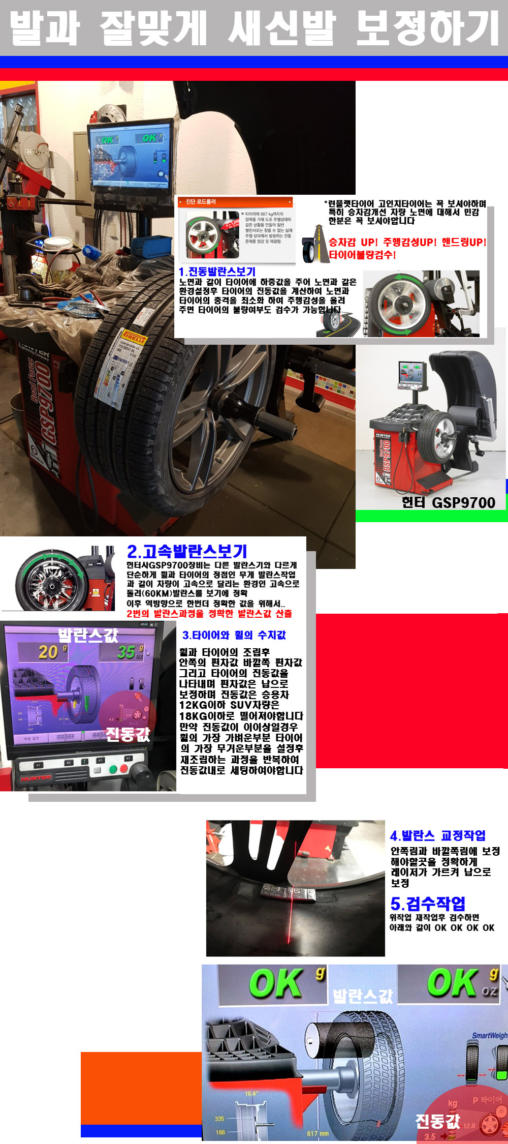 이후 미국 헌터사 GSP9700장비로 고속 및 진동발란스로 더욱더 작업의 정확도와 정밀도를 높였습니다 이장비는 노면에서 올라오는 진동값까지 계산하여 발란스값을 보는 방식으로 진동발란스기는 헌터사GSP9700장비가 유일합니다 이후 역방향으로 60키로의 고속으로 다시 발란스값을 보정하는 방식입니다 그래서 노면에서 올라오는 진동를 잡을수 있으며 특히 타이어의 노면력 측정으로 타이어의 불량여부까지도 검수가 가능한 장비입니다 특히 고속발란스 측정시 타사 발란스기와 틀리게 고속으로 발란스를 보기에 차량이 고속으로 달리는 시뮤레이션 구현이 가능하여 정확한 발란스값을 볼수가 있습니다 그리고 작업자에게는 불필요한 발란스납을 붙이지 않아 미관상으로 좋고 납을 절약하는 고객님에게도윈이고 작업자에게도 윈윈할수 있는 장비입니다 그리고 시중에서 고속진동발란스라고 말하시는 샵들이 많은데 꼭아셔야하는것은 고속발란스는 말그대로 발란스를 볼때 고속으로 돌리기에 60키로 전후 그리고 진동값을 계산하기위해서는 발란스기에 진동롤러가 있어야합니다 그래서 미국헌터사 GSP9700장비가 유일합니다 다른 샵에서 말하는 발란스기는 고속진동발란스기능없는 일반발란스 기기입니다 이점 꼭 아시고 장착하시기를 바랍니다