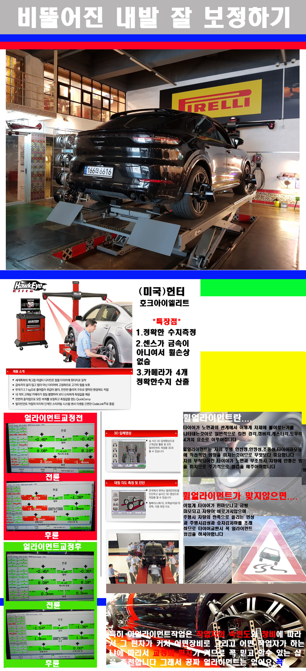 이후 미국 헌터사 호크아이엘리트 장비로 3D얼라이먼트를 진행했습니다 이장비는 현존하는 가장 진화된 얼라이먼트장비입니다 특히 4개의 고성능카메라가 장착되어져 있어 실시간으로 오차가 없는 측정값을 구현하며 바퀴당 각 휠센서 클램프가 프라스틱이며 타이어바닦면을 지지하는 방식이여서 휠의 손상이 없는것이 특징입니다 하지만 장비보다 차량의 얼라이먼트를 볼시 작업자의 정성과 그리고 능력과 숙련도가 관견이기에 꼭 휠얼라이먼트를 장사수단으로 하지않는 샵을 권장합니다 자사는 얼라이먼트정렬시 교정전 교정후를 구분하여 고객님께 직접 이수치값을 확인시켜드리고 작업을 하며 이후 각각의 특성을 가진 타이어들에 대해서 설명 및 관리요령 운전요령 같이 설명해드리고 있습니다 이후 타이어와 휠의 정확한 발란스값과 진동값을 보정후 헌터사 호크아이엘리트 3D얼라이먼트장비로 공장에서 처음 출고될시의 팩토리값으로 교정하였습니다 그리고 타이어질소가스주입기로 3번정도 진공상태로 만든후 질소가스를 주입했습니다 질소가스주입시 가장 관견은 순도이기에 이런 여러번의 진공상태후 주입하고 빼주는 과정를 많이 해주어야합니다 질소가스의 주입시 타이어공기압의 저하가 덜하고 화합물질이 반응을 하지않아 소음전파력과 그리고 타이어안쪽에 수분을 발생하지않으며 타이어안쪽에서의 공기압이 팽창하지않아 타이어에 스트레스를 덜주게 됩니다 하지만 이부분도 공기속에 질소가 80%정도 존재하기에 미미한 차이이지만 질소순도를 높이고 주행시 좋은 점이 확연히 많기에 질소주입을 해드리고 있습니다 특히 고성능타이어나 하중값을 많이 주는 타이어일경우에는 위에서 언급한 부분에서 많이 차이를 보이고 있습니다 이후 타이어왁싱후 출고했습니다+ 감사합니다