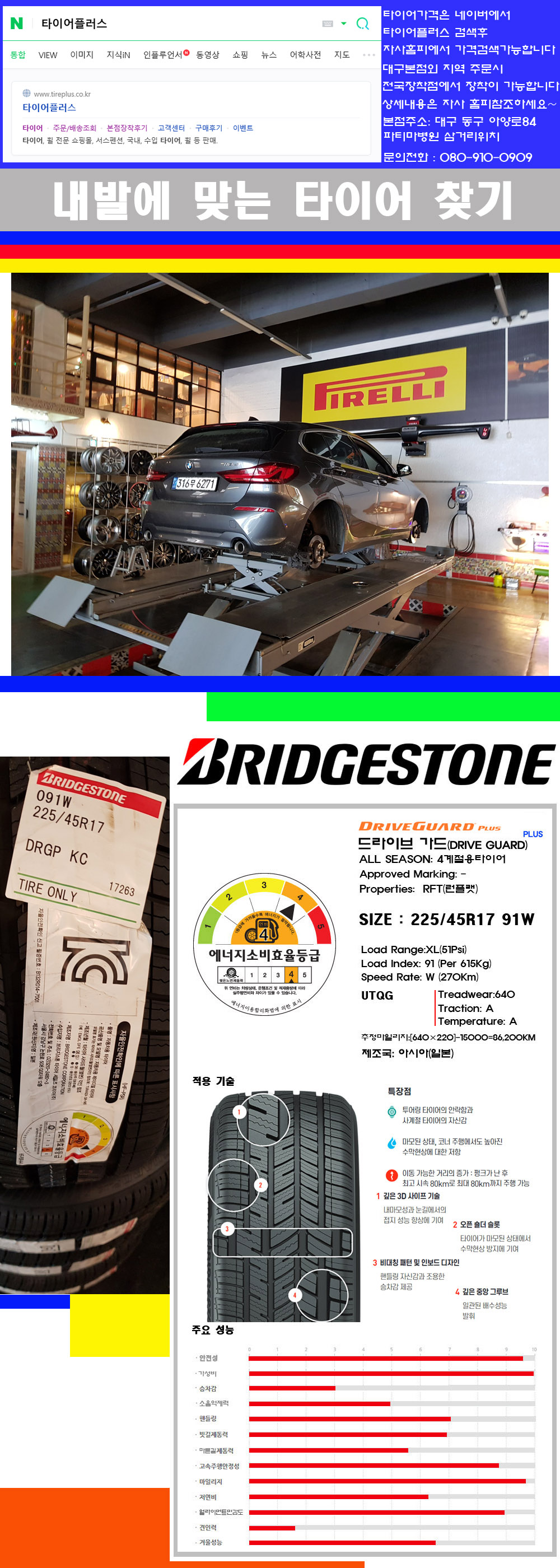 ♥♥♥본점 대구 동구 아양로84 (파티마삼거리 위치) 국산 수입타이어 할인행사중♥♥♥ 타이어플러스 대구본점은 전국에서 가장 규모가 큰매장입니다 물론 자사는 지하층 지상4층건물이며 1층작업장이외는 모두 창고로 사용중인 회사입니다 대구광역시 동구 아양로84(파티마병원 네거리에 위치)그래서 매장으로 바로 오시면 당일에 바로 장착이 가능합니다 물론 한국 금호 넥센 브리지스톤 미쉐린 콘티넨탈 피렐리 던롭 굳이어 요코하마 등 세계유수의 10대 브랜드타이어만 취급하고 있습니다 타이어매장중 단일규모로는 아마 전국에서 제일 커지않을까 생각합니다 가격도 인터넷 최저가로 장착해 드리고 있습니다 고객님들이 오시면서 너무 고급스러워 가격도 비싸지 않을까 생각하시는데 네이버에서 타이어플러스사이트를 검색해보시면 가격 또한 정말 싸게 판매하고 있구나 하고 생각하실것입니다 물론 장비도 현존하는 장비중 가장 최신장비와 그리고 유럽풍 인테리어의 최고급매장입니다 무엇하나 정품만 취급하며 작업또한 꼼꼼하게 매뉴얼에 따라서 작업을 해드립니다 특히 사장님의 이력이 화려한데 자동차경주 레이스와 미캐닉 국제자격증(A)소지자로서 경험한 풍부한 자동차의 지식을 갖춘분이십니다 특히 자동차잡지사에 타이어에 관한 내용도 기재하신 분이며 타이어회사의 타이어테스트드라이브로도 참여한 분이십니다 제품의 품질이나 제품의 성능등을 장사수단으로 말하지 않고 있는 그대로 말해드리며 특히 사장님 성격상 거짓말을 못하는 성격이여서 믿고 맡겨주시면 후회하지 않을 것입니다 그래서 사장님께서 직접상담해주시고 장착도 해주시는 매장이기에 더 신뢰가 가지 않을까 생각합니다 자사는 인터넷 최저가 기반으로 성장한 회사이기에 가격또한 인터넷 최저가로 장착해 드리고 있습니다 그리고 자사는 고객만족도에서 대상까지 수상한 회사입니다 그래서 한번 저의 매장에서 작업하신 고객님은 아마 다른곳에서는 아마 눈에 차지 않을것이라 생각합니다 가격이면 가격 작업의 완성도면 완성도 그리고 사후 관리까지 최고중에 최고가 되기위해서 노력하는 매장입니다 지금까지 어느 매장에서도 느끼지 못한 감성들을 느끼시기를 바랍니다 감사합니다