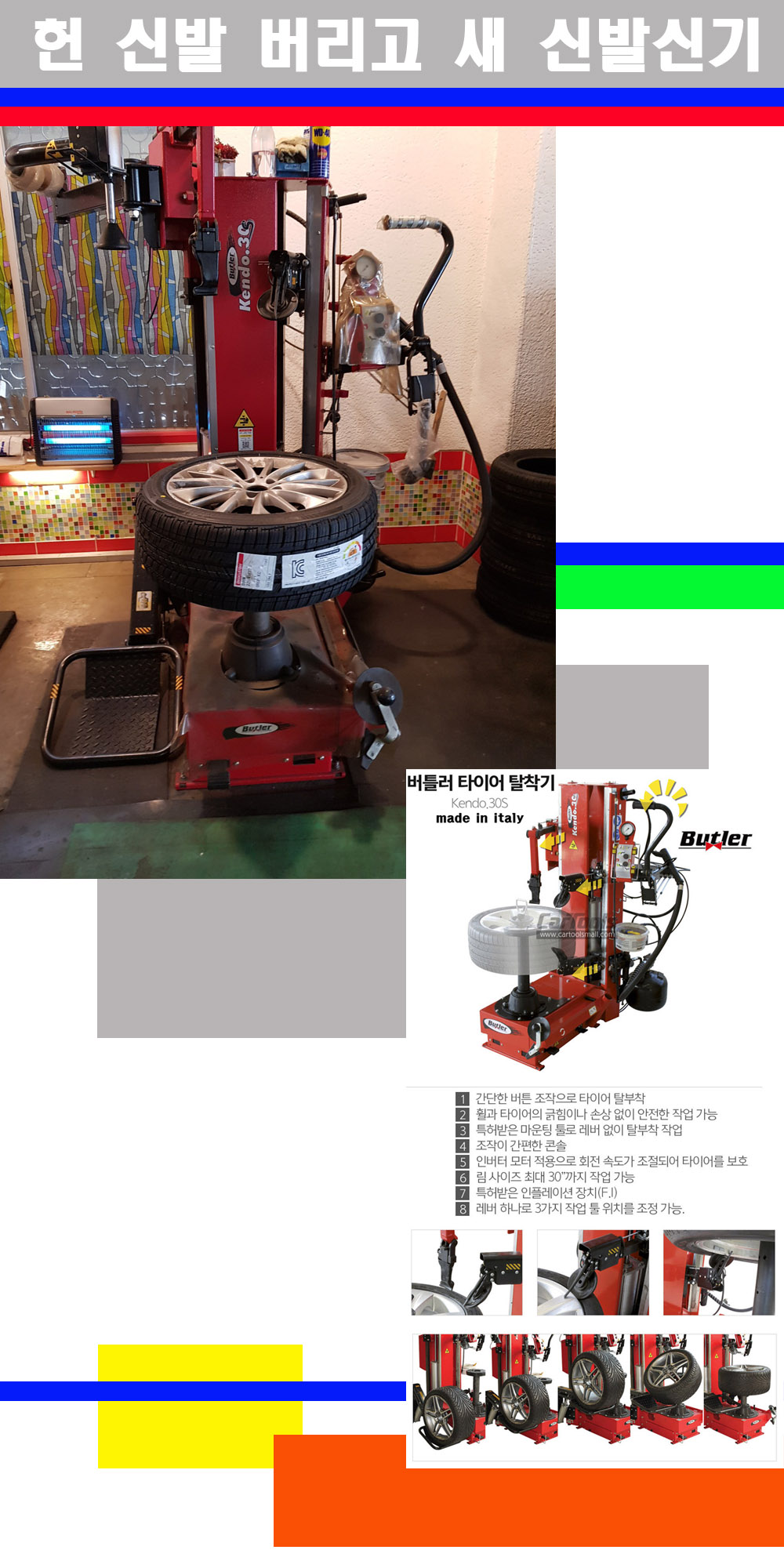 이태리 버틀러사의 켄도3.0S는 휠과 타이어와 조립과 분리시 전혀 제품에 손상을 주지않는 탈착기로 특히 센터락방식(중앙에서 휠를 고정하는 방식)이여서 휠의 중앙부위 잡아서 타이어를 탈부착하고 이후 상하롤러로 타이어를 탈부착합니다 특히 유니포미티작업(휠의 가장가벼운부분과 타이어의 가장 무거운부분을 매칭시키는 작업)시 작업자가 타이어를 정확한 지점에 휠과 매칭시킬수 있는 장점도 있습니다 유니포미티작업 불량시 과도한 진동값으로 핸들링불안 승차감저하 과도한 노면의 충격흡수를 가져와 주행감성을 해치는 첫번째 이유입니다 하지만 이런 작업을 무시하고 그냥 정적인 휠발란스작업만 하는것이 현실입니다 보통 타이어가격만 생각하시고 장착을 하시는데 꼭 이런 부분까지 챙길수 있는 샵을 권장합니다