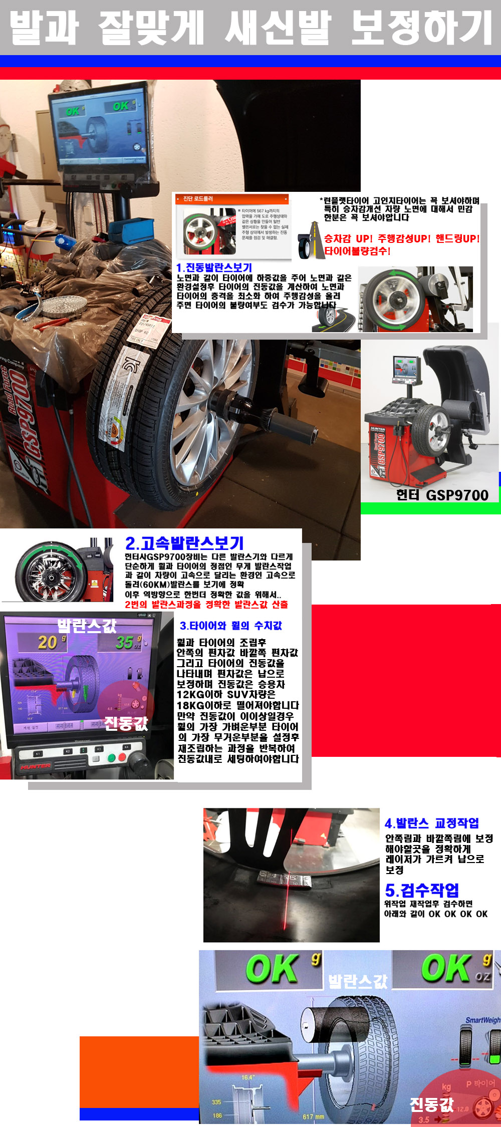 이후 미국 헌터사 GSP9700장비로 고속 및 진동발란스로 더욱더 작업의 정확도와 정밀도를 높였습니다 이장비는 노면에서 올라오는 진동값까지 계산하여 발란스값을 보는 방식으로 진동발란스기는 헌터사GSP9700장비가 유일합니다 이후 역방향으로 60키로의 고속으로 다시 발란스값을 보정하는 방식입니다 그래서 노면에서 올라오는 진동를 잡을수 있으며 특히 타이어의 노면력 측정으로 타이어의 불량여부까지도 검수가 가능한 장비입니다 특히 고속발란스 측정시 타사 발란스기와 틀리게 고속으로 발란스를 보기에 차량이 고속으로 달리는 시뮤레이션 구현이 가능하여 정확한 발란스값을 볼수가 있습니다 그리고 작업자에게는 불필요한 발란스납을 붙이지 않아 미관상으로 좋고 납을 절약하는 고객님에게도윈이고 작업자에게도 윈윈할수 있는 장비입니다 그리고 시중에서 고속진동발란스라고 말하시는 샵들이 많은데 꼭아셔야하는것은 고속발란스는 말그대로 발란스를 볼때 고속으로 돌리기에 60키로 전후 그리고 진동값을 계산하기위해서는 발란스기에 진동롤러가 있어야합니다 그래서 미국헌터사 GSP9700장비가 유일합니다 다른 샵에서 말하는 발란스기는 고속진동발란스기능없는 일반발란스 기기입니다 이점 꼭 아시고 장착하시기를 바랍니다