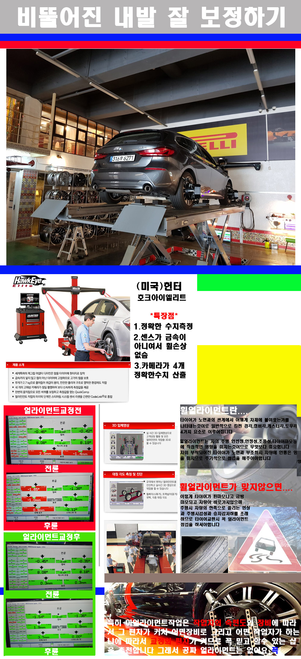 이후 미국 헌터사 호크아이엘리트 장비로 3D얼라이먼트를 진행했습니다 이장비는 현존하는 가장 진화된 얼라이먼트장비입니다 특히 4개의 고성능카메라가 장착되어져 있어 실시간으로 오차가 없는 측정값을 구현하며 바퀴당 각 휠센서 클램프가 프라스틱이며 타이어바닦면을 지지하는 방식이여서 휠의 손상이 없는것이 특징입니다 하지만 장비보다 차량의 얼라이먼트를 볼시 작업자의 정성과 그리고 능력과 숙련도가 관견이기에 꼭 휠얼라이먼트를 장사수단으로 하지않는 샵을 권장합니다 자사는 얼라이먼트정렬시 교정전 교정후를 구분하여 고객님께 직접 이수치값을 확인시켜드리고 작업을 하며 이후 각각의 특성을 가진 타이어들에 대해서 설명 및 관리요령 운전요령 같이 설명해드리고 있습니다 이후 타이어와 휠의 정확한 발란스값과 진동값을 보정후 헌터사 호크아이엘리트 3D얼라이먼트장비로 공장에서 처음 출고될시의 팩토리값으로 교정하였습니다 그리고 타이어질소가스주입기로 3번정도 진공상태로 만든후 질소가스를 주입했습니다 질소가스주입시 가장 관견은 순도이기에 이런 여러번의 진공상태후 주입하고 빼주는 과정를 많이 해주어야합니다 질소가스의 주입시 타이어공기압의 저하가 덜하고 화합물질이 반응을 하지않아 소음전파력과 그리고 타이어안쪽에 수분을 발생하지않으며 타이어안쪽에서의 공기압이 팽창하지않아 타이어에 스트레스를 덜주게 됩니다 하지만 이부분도 공기속에 질소가 80%정도 존재하기에 미미한 차이이지만 질소순도를 높이고 주행시 좋은 점이 확연히 많기에 질소주입을 해드리고 있습니다 특히 고성능타이어나 하중값을 많이 주는 타이어일경우에는 위에서 언급한 부분에서 많이 차이를 보이고 있습니다 이후 타이어왁싱후 출고했습니다+ 감사합니다