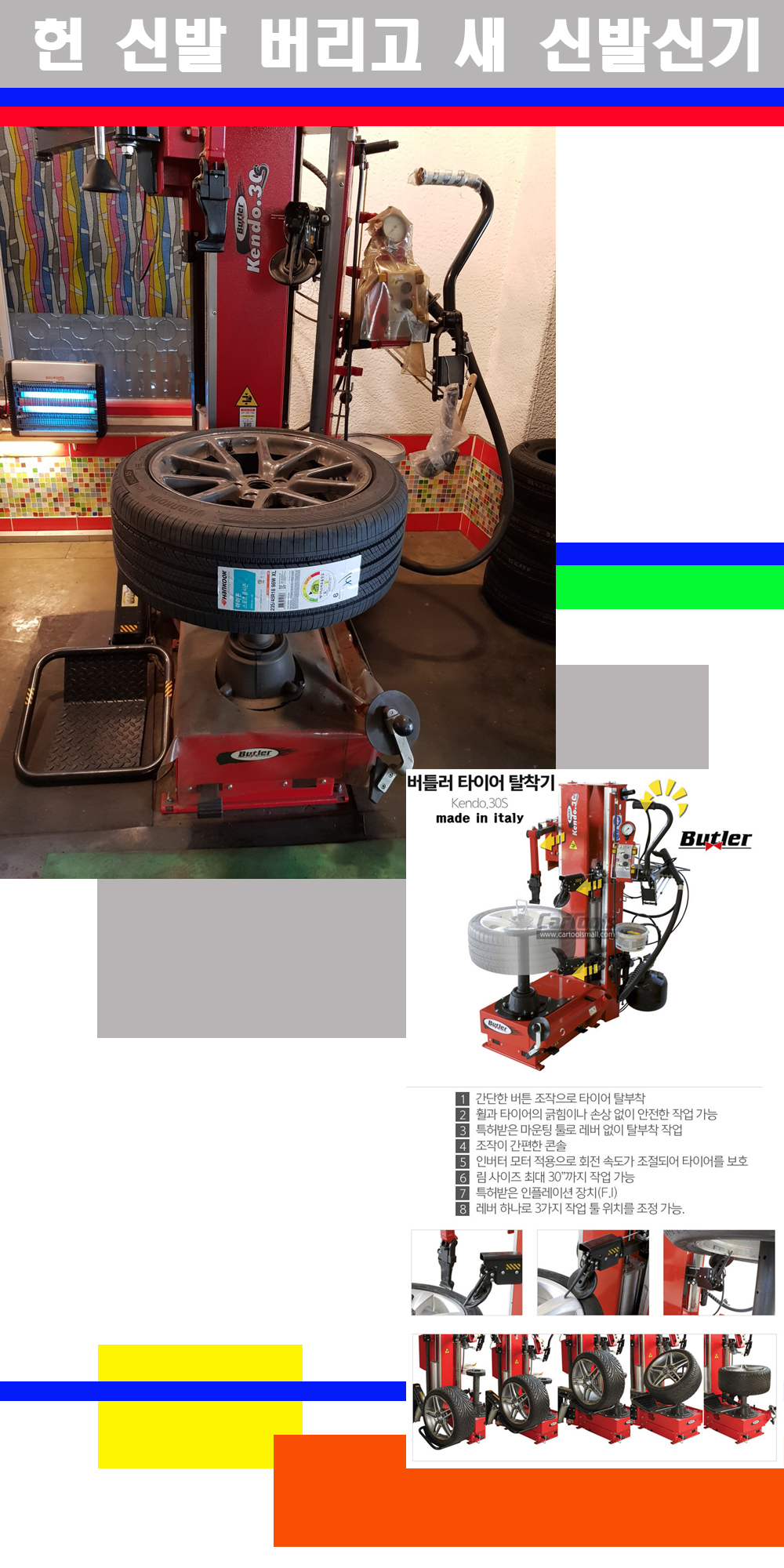 이태리 버틀러사의 켄도3.0S는 휠과 타이어와 조립과 분리시 전혀 제품에 손상을 주지않는 탈착기로 특히 센터락방식(중앙에서 휠를 고정하는 방식)이여서 휠의 중앙부위 잡아서 타이어를 탈부착하고 이후 상하롤러로 타이어를 탈부착합니다 특히 유니포미티작업(휠의 가장가벼운부분과 타이어의 가장 무거운부분을 매칭시키는 작업)시 작업자가 타이어를 정확한 지점에 휠과 매칭시킬수 있는 장점도 있습니다 유니포미티작업 불량시 과도한 진동값으로 핸들링불안 승차감저하 과도한 노면의 충격흡수를 가져와 주행감성을 해치는 첫번째 이유입니다 하지만 이런 작업을 무시하고 그냥 정적인 휠발란스작업만 하는것이 현실입니다 보통 타이어가격만 생각하시고 장착을 하시는데 꼭 이런 부분까지 챙길수 있는 샵을 권장합니다
