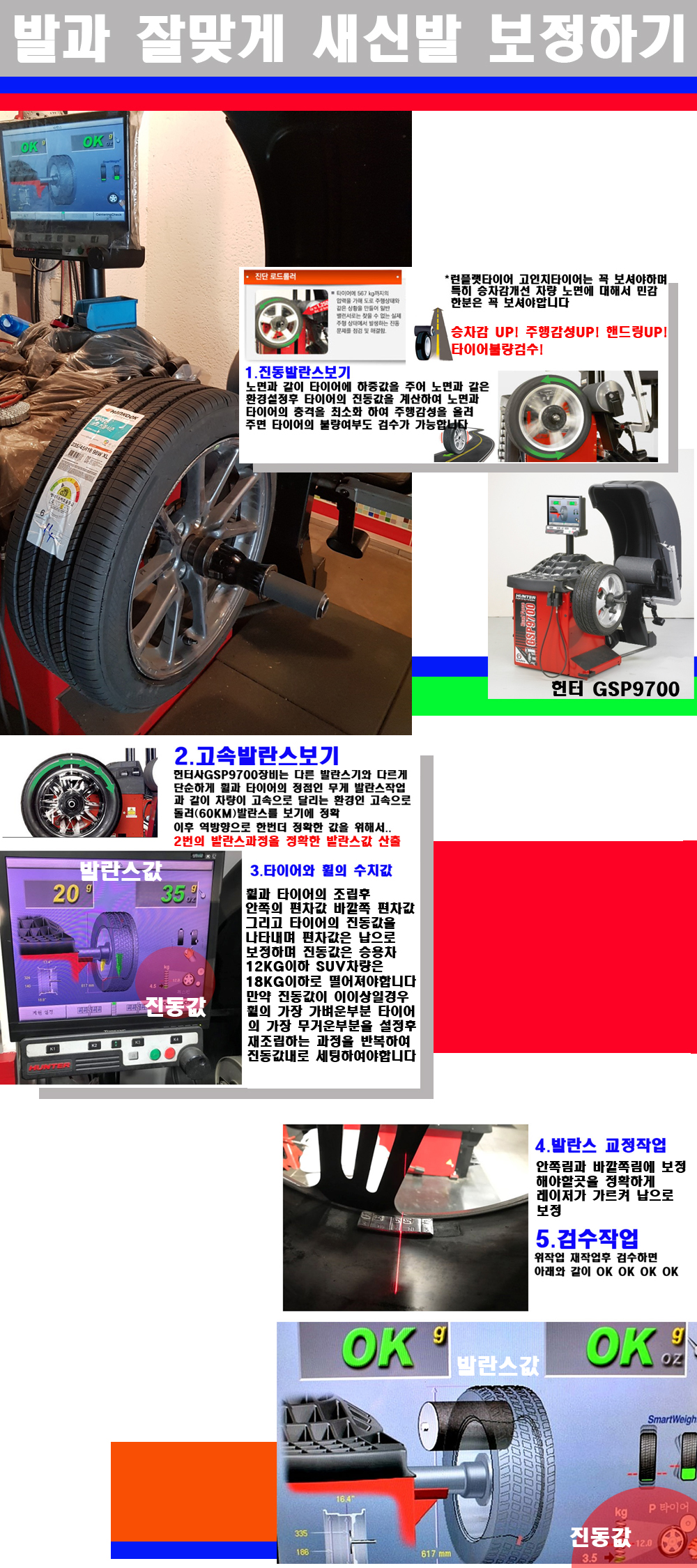 이후 미국 헌터사 GSP9700장비로 고속 및 진동발란스로 더욱더 작업의 정확도와 정밀도를 높였습니다 이장비는 노면에서 올라오는 진동값까지 계산하여 발란스값을 보는 방식으로 진동발란스기는 헌터사GSP9700장비가 유일합니다 이후 역방향으로 60키로의 고속으로 다시 발란스값을 보정하는 방식입니다 그래서 노면에서 올라오는 진동를 잡을수 있으며 특히 타이어의 노면력 측정으로 타이어의 불량여부까지도 검수가 가능한 장비입니다 특히 고속발란스 측정시 타사 발란스기와 틀리게 고속으로 발란스를 보기에 차량이 고속으로 달리는 시뮤레이션 구현이 가능하여 정확한 발란스값을 볼수가 있습니다 그리고 작업자에게는 불필요한 발란스납을 붙이지 않아 미관상으로 좋고 납을 절약하는 고객님에게도윈이고 작업자에게도 윈윈할수 있는 장비입니다 그리고 시중에서 고속진동발란스라고 말하시는 샵들이 많은데 꼭아셔야하는것은 고속발란스는 말그대로 발란스를 볼때 고속으로 돌리기에 60키로 전후 그리고 진동값을 계산하기위해서는 발란스기에 진동롤러가 있어야합니다 그래서 미국헌터사 GSP9700장비가 유일합니다 다른 샵에서 말하는 발란스기는 고속진동발란스기능없는 일반발란스 기기입니다 이점 꼭 아시고 장착하시기를 바랍니다