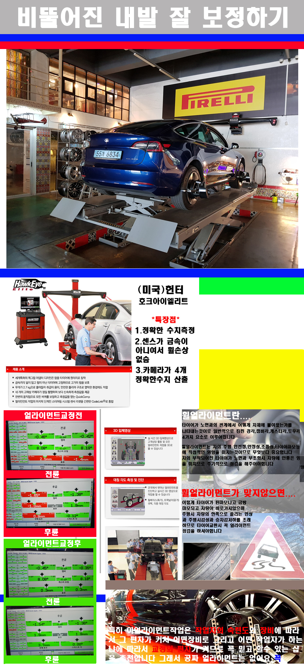 이후 미국 헌터사 호크아이엘리트 장비로 3D얼라이먼트를 진행했습니다 이장비는 현존하는 가장 진화된 얼라이먼트장비입니다 특히 4개의 고성능카메라가 장착되어져 있어 실시간으로 오차가 없는 측정값을 구현하며 바퀴당 각 휠센서 클램프가 프라스틱이며 타이어바닦면을 지지하는 방식이여서 휠의 손상이 없는것이 특징입니다 하지만 장비보다 차량의 얼라이먼트를 볼시 작업자의 정성과 그리고 능력과 숙련도가 관견이기에 꼭 휠얼라이먼트를 장사수단으로 하지않는 샵을 권장합니다 자사는 얼라이먼트정렬시 교정전 교정후를 구분하여 고객님께 직접 이수치값을 확인시켜드리고 작업을 하며 이후 각각의 특성을 가진 타이어들에 대해서 설명 및 관리요령 운전요령 같이 설명해드리고 있습니다 이후 타이어와 휠의 정확한 발란스값과 진동값을 보정후 헌터사 호크아이엘리트 3D얼라이먼트장비로 공장에서 처음 출고될시의 팩토리값으로 교정하였습니다 그리고 타이어질소가스주입기로 3번정도 진공상태로 만든후 질소가스를 주입했습니다 질소가스주입시 가장 관견은 순도이기에 이런 여러번의 진공상태후 주입하고 빼주는 과정를 많이 해주어야합니다 질소가스의 주입시 타이어공기압의 저하가 덜하고 화합물질이 반응을 하지않아 소음전파력과 그리고 타이어안쪽에 수분을 발생하지않으며 타이어안쪽에서의 공기압이 팽창하지않아 타이어에 스트레스를 덜주게 됩니다 하지만 이부분도 공기속에 질소가 80%정도 존재하기에 미미한 차이이지만 질소순도를 높이고 주행시 좋은 점이 확연히 많기에 질소주입을 해드리고 있습니다 특히 고성능타이어나 하중값을 많이 주는 타이어일경우에는 위에서 언급한 부분에서 많이 차이를 보이고 있습니다 이후 타이어왁싱후 출고했습니다+ 감사합니다