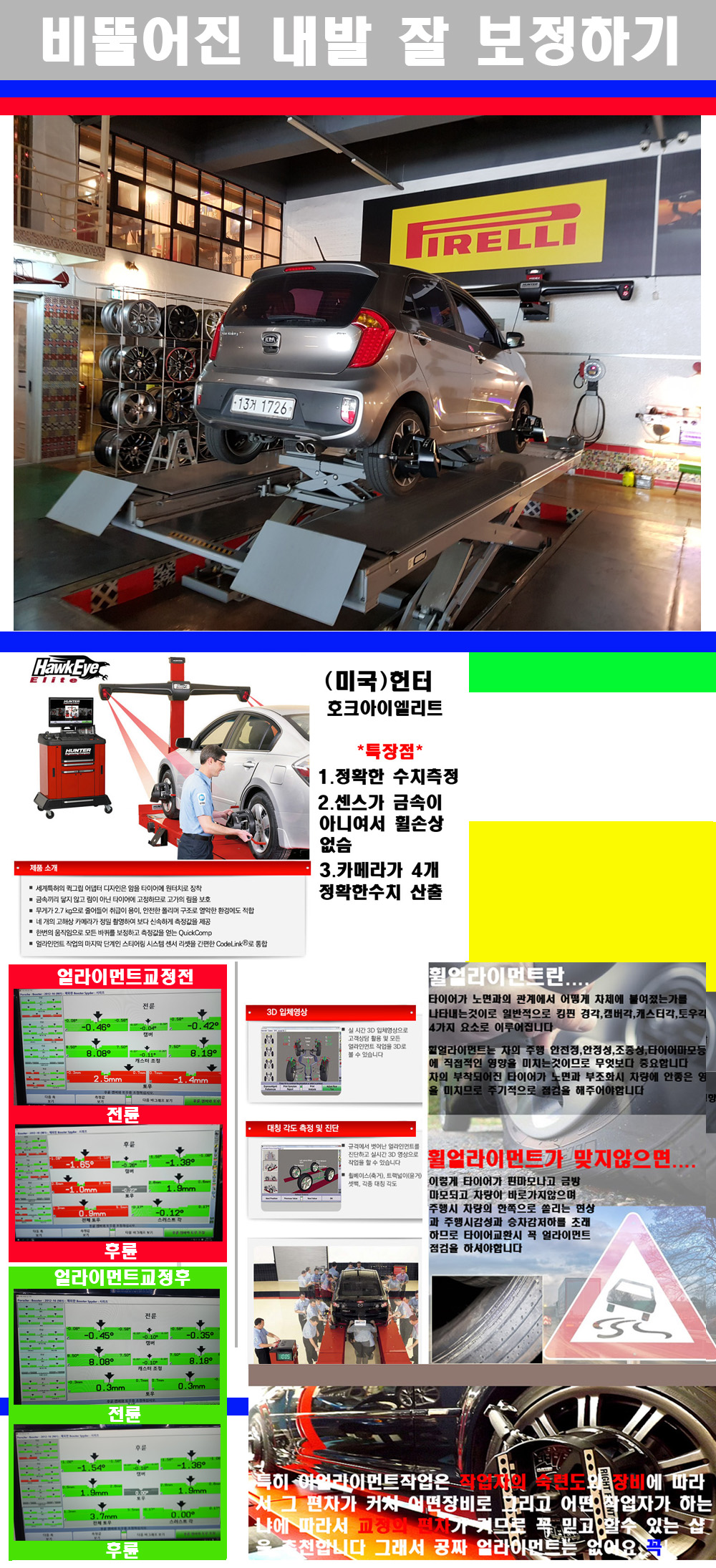 이후 미국 헌터사 호크아이엘리트 장비로 3D얼라이먼트를 진행했습니다 이장비는 현존하는 가장 진화된 얼라이먼트장비입니다 특히 4개의 고성능카메라가 장착되어져 있어 실시간으로 오차가 없는 측정값을 구현하며 바퀴당 각 휠센서 클램프가 프라스틱이며 타이어바닦면을 지지하는 방식이여서 휠의 손상이 없는것이 특징입니다 하지만 장비보다 차량의 얼라이먼트를 볼시 작업자의 정성과 그리고 능력과 숙련도가 관견이기에 꼭 휠얼라이먼트를 장사수단으로 하지않는 샵을 권장합니다 자사는 얼라이먼트정렬시 교정전 교정후를 구분하여 고객님께 직접 이수치값을 확인시켜드리고 작업을 하며 이후 각각의 특성을 가진 타이어들에 대해서 설명 및 관리요령 운전요령 같이 설명해드리고 있습니다 이후 타이어와 휠의 정확한 발란스값과 진동값을 보정후 헌터사 호크아이엘리트 3D얼라이먼트장비로 공장에서 처음 출고될시의 팩토리값으로 교정하였습니다 그리고 타이어질소가스주입기로 3번정도 진공상태로 만든후 질소가스를 주입했습니다 질소가스주입시 가장 관견은 순도이기에 이런 여러번의 진공상태후 주입하고 빼주는 과정를 많이 해주어야합니다 질소가스의 주입시 타이어공기압의 저하가 덜하고 화합물질이 반응을 하지않아 소음전파력과 그리고 타이어안쪽에 수분을 발생하지않으며 타이어안쪽에서의 공기압이 팽창하지않아 타이어에 스트레스를 덜주게 됩니다 하지만 이부분도 공기속에 질소가 80%정도 존재하기에 미미한 차이이지만 질소순도를 높이고 주행시 좋은 점이 확연히 많기에 질소주입을 해드리고 있습니다 특히 고성능타이어나 하중값을 많이 주는 타이어일경우에는 위에서 언급한 부분에서 많이 차이를 보이고 있습니다 이후 타이어왁싱후 출고했습니다+ 감사합니다