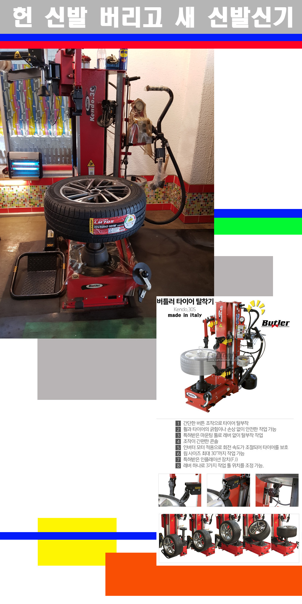 이태리 버틀러사의 켄도3.0S는 휠과 타이어와 조립과 분리시 전혀 제품에 손상을 주지않는 탈착기로 특히 센터락방식(중앙에서 휠를 고정하는 방식)이여서 휠의 중앙부위 잡아서 타이어를 탈부착하고 이후 상하롤러로 타이어를 탈부착합니다 특히 유니포미티작업(휠의 가장가벼운부분과 타이어의 가장 무거운부분을 매칭시키는 작업)시 작업자가 타이어를 정확한 지점에 휠과 매칭시킬수 있는 장점도 있습니다 유니포미티작업 불량시 과도한 진동값으로 핸들링불안 승차감저하 과도한 노면의 충격흡수를 가져와 주행감성을 해치는 첫번째 이유입니다 하지만 이런 작업을 무시하고 그냥 정적인 휠발란스작업만 하는것이 현실입니다 보통 타이어가격만 생각하시고 장착을 하시는데 꼭 이런 부분까지 챙길수 있는 샵을 권장합니다