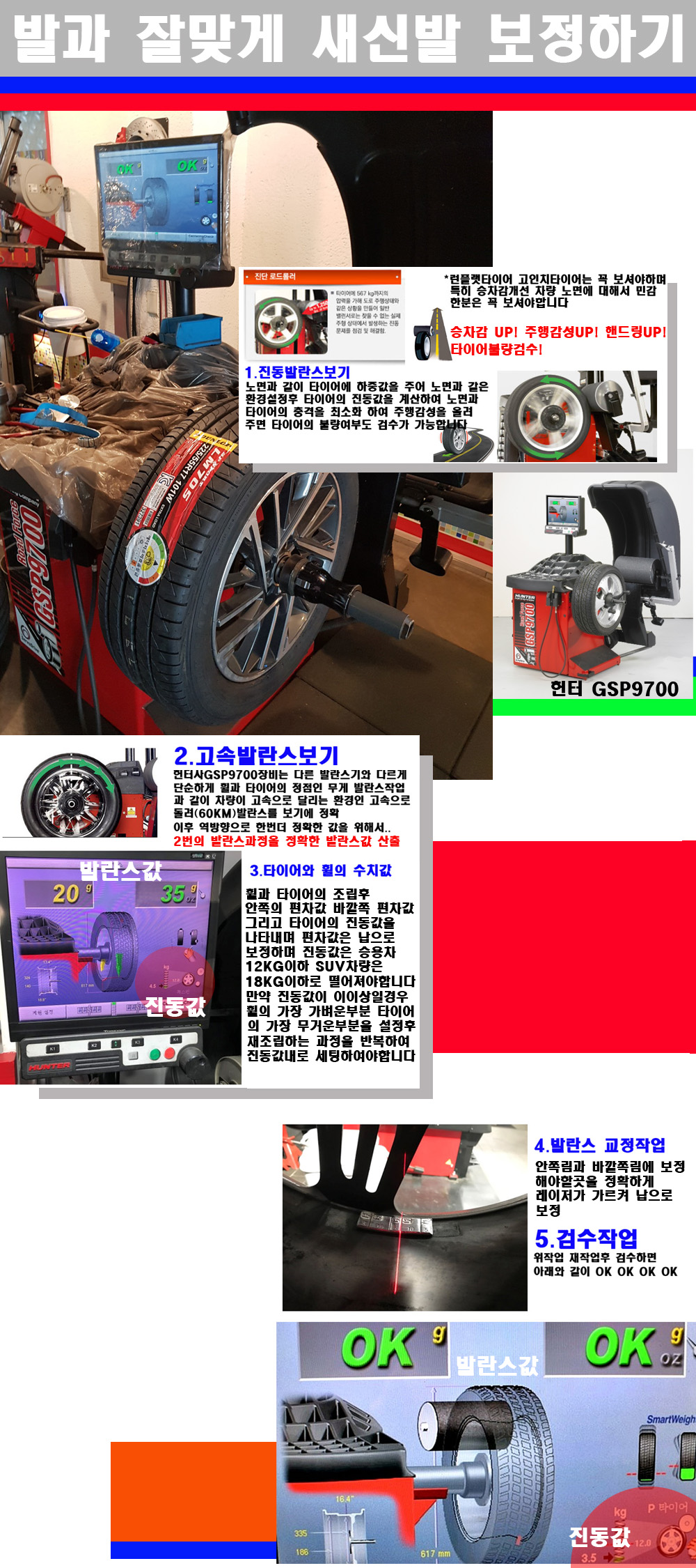 이후 미국 헌터사 GSP9700장비로 고속 및 진동발란스로 더욱더 작업의 정확도와 정밀도를 높였습니다 이장비는 노면에서 올라오는 진동값까지 계산하여 발란스값을 보는 방식으로 진동발란스기는 헌터사GSP9700장비가 유일합니다 이후 역방향으로 60키로의 고속으로 다시 발란스값을 보정하는 방식입니다 그래서 노면에서 올라오는 진동를 잡을수 있으며 특히 타이어의 노면력 측정으로 타이어의 불량여부까지도 검수가 가능한 장비입니다 특히 고속발란스 측정시 타사 발란스기와 틀리게 고속으로 발란스를 보기에 차량이 고속으로 달리는 시뮤레이션 구현이 가능하여 정확한 발란스값을 볼수가 있습니다 그리고 작업자에게는 불필요한 발란스납을 붙이지 않아 미관상으로 좋고 납을 절약하는 고객님에게도윈이고 작업자에게도 윈윈할수 있는 장비입니다 그리고 시중에서 고속진동발란스라고 말하시는 샵들이 많은데 꼭아셔야하는것은 고속발란스는 말그대로 발란스를 볼때 고속으로 돌리기에 60키로 전후 그리고 진동값을 계산하기위해서는 발란스기에 진동롤러가 있어야합니다 그래서 미국헌터사 GSP9700장비가 유일합니다 다른 샵에서 말하는 발란스기는 고속진동발란스기능없는 일반발란스 기기입니다 이점 꼭 아시고 장착하시기를 바랍니다