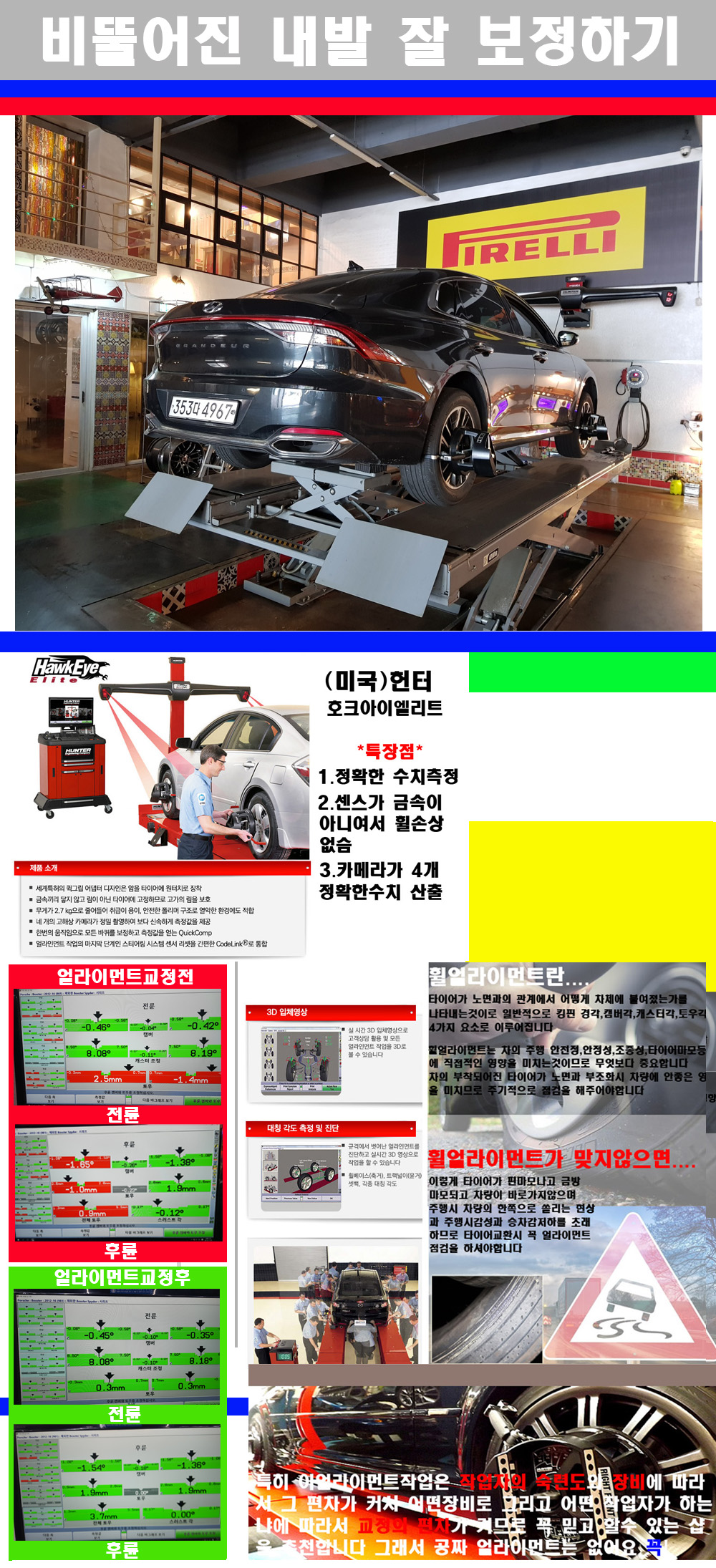 이후 미국 헌터사 호크아이엘리트 장비로 3D얼라이먼트를 진행했습니다 이장비는 현존하는 가장 진화된 얼라이먼트장비입니다 특히 4개의 고성능카메라가 장착되어져 있어 실시간으로 오차가 없는 측정값을 구현하며 바퀴당 각 휠센서 클램프가 프라스틱이며 타이어바닦면을 지지하는 방식이여서 휠의 손상이 없는것이 특징입니다 하지만 장비보다 차량의 얼라이먼트를 볼시 작업자의 정성과 그리고 능력과 숙련도가 관견이기에 꼭 휠얼라이먼트를 장사수단으로 하지않는 샵을 권장합니다 자사는 얼라이먼트정렬시 교정전 교정후를 구분하여 고객님께 직접 이수치값을 확인시켜드리고 작업을 하며 이후 각각의 특성을 가진 타이어들에 대해서 설명 및 관리요령 운전요령 같이 설명해드리고 있습니다 이후 타이어와 휠의 정확한 발란스값과 진동값을 보정후 헌터사 호크아이엘리트 3D얼라이먼트장비로 공장에서 처음 출고될시의 팩토리값으로 교정하였습니다 그리고 타이어질소가스주입기로 3번정도 진공상태로 만든후 질소가스를 주입했습니다 질소가스주입시 가장 관견은 순도이기에 이런 여러번의 진공상태후 주입하고 빼주는 과정를 많이 해주어야합니다 질소가스의 주입시 타이어공기압의 저하가 덜하고 화합물질이 반응을 하지않아 소음전파력과 그리고 타이어안쪽에 수분을 발생하지않으며 타이어안쪽에서의 공기압이 팽창하지않아 타이어에 스트레스를 덜주게 됩니다 하지만 이부분도 공기속에 질소가 80%정도 존재하기에 미미한 차이이지만 질소순도를 높이고 주행시 좋은 점이 확연히 많기에 질소주입을 해드리고 있습니다 특히 고성능타이어나 하중값을 많이 주는 타이어일경우에는 위에서 언급한 부분에서 많이 차이를 보이고 있습니다 이후 타이어왁싱후 출고했습니다+ 감사합니다