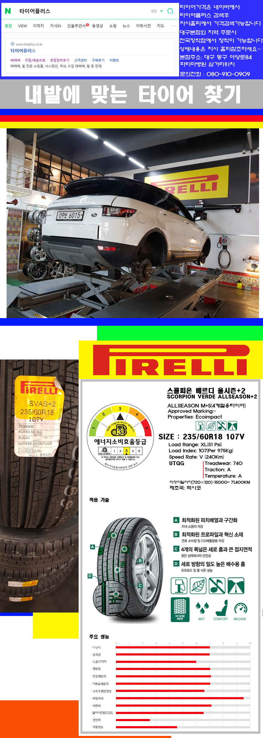 ♥♥♥본점 대구 동구 아양로84 (파티마삼거리 위치) 국산 수입타이어 할인행사중♥♥♥ 타이어플러스 대구본점은 전국에서 가장 규모가 큰매장입니다 물론 자사는 지하층 지상4층건물이며 1층작업장이외는 모두 창고로 사용중인 회사입니다 대구광역시 동구 아양로84(파티마병원 네거리에 위치)그래서 매장으로 바로 오시면 당일에 바로 장착이 가능합니다 물론 한국 금호 넥센 브리지스톤 미쉐린 콘티넨탈 피렐리 던롭 굳이어 요코하마 등 세계유수의 10대 브랜드타이어만 취급하고 있습니다 타이어매장중 단일규모로는 아마 전국에서 제일 커지않을까 생각합니다 가격도 인터넷 최저가로 장착해 드리고 있습니다 고객님들이 오시면서 너무 고급스러워 가격도 비싸지 않을까 생각하시는데 네이버에서 타이어플러스사이트를 검색해보시면 가격 또한 정말 싸게 판매하고 있구나 하고 생각하실것입니다 물론 장비도 현존하는 장비중 가장 최신장비와 그리고 유럽풍 인테리어의 최고급매장입니다 무엇하나 정품만 취급하며 작업또한 꼼꼼하게 매뉴얼에 따라서 작업을 해드립니다 특히 사장님의 이력이 화려한데 자동차경주 레이스와 미캐닉 국제자격증(A)소지자로서 경험한 풍부한 자동차의 지식을 갖춘분이십니다 특히 자동차잡지사에 타이어에 관한 내용도 기재하신 분이며 타이어회사의 타이어테스트드라이브로도 참여한 분이십니다 제품의 품질이나 제품의 성능등을 장사수단으로 말하지 않고 있는 그대로 말해드리며 특히 사장님 성격상 거짓말을 못하는 성격이여서 믿고 맡겨주시면 후회하지 않을 것입니다 그래서 사장님께서 직접상담해주시고 장착도 해주시는 매장이기에 더 신뢰가 가지 않을까 생각합니다 자사는 인터넷 최저가 기반으로 성장한 회사이기에 가격또한 인터넷 최저가로 장착해 드리고 있습니다 그리고 자사는 고객만족도에서 대상까지 수상한 회사입니다 그래서 한번 저의 매장에서 작업하신 고객님은 아마 다른곳에서는 아마 눈에 차지 않을것이라 생각합니다 가격이면 가격 작업의 완성도면 완성도 그리고 사후 관리까지 최고중에 최고가 되기위해서 노력하는 매장입니다 지금까지 어느 매장에서도 느끼지 못한 감성들을 느끼시기를 바랍니다 감사합니다