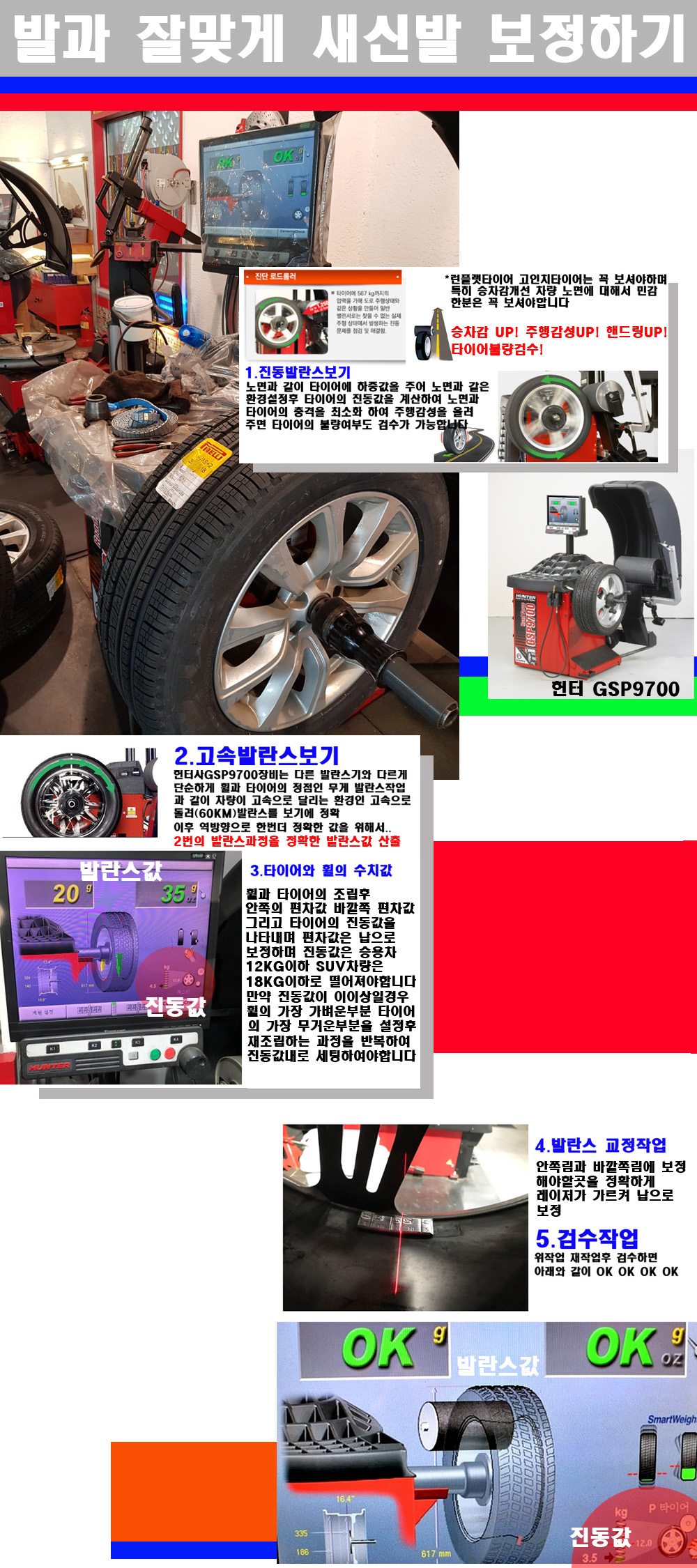 이후 미국 헌터사 GSP9700장비로 고속 및 진동발란스로 더욱더 작업의 정확도와 정밀도를 높였습니다 이장비는 노면에서 올라오는 진동값까지 계산하여 발란스값을 보는 방식으로 진동발란스기는 헌터사GSP9700장비가 유일합니다 이후 역방향으로 60키로의 고속으로 다시 발란스값을 보정하는 방식입니다 그래서 노면에서 올라오는 진동를 잡을수 있으며 특히 타이어의 노면력 측정으로 타이어의 불량여부까지도 검수가 가능한 장비입니다 특히 고속발란스 측정시 타사 발란스기와 틀리게 고속으로 발란스를 보기에 차량이 고속으로 달리는 시뮤레이션 구현이 가능하여 정확한 발란스값을 볼수가 있습니다 그리고 작업자에게는 불필요한 발란스납을 붙이지 않아 미관상으로 좋고 납을 절약하는 고객님에게도윈이고 작업자에게도 윈윈할수 있는 장비입니다 그리고 시중에서 고속진동발란스라고 말하시는 샵들이 많은데 꼭아셔야하는것은 고속발란스는 말그대로 발란스를 볼때 고속으로 돌리기에 60키로 전후 그리고 진동값을 계산하기위해서는 발란스기에 진동롤러가 있어야합니다 그래서 미국헌터사 GSP9700장비가 유일합니다 다른 샵에서 말하는 발란스기는 고속진동발란스기능없는 일반발란스 기기입니다 이점 꼭 아시고 장착하시기를 바랍니다