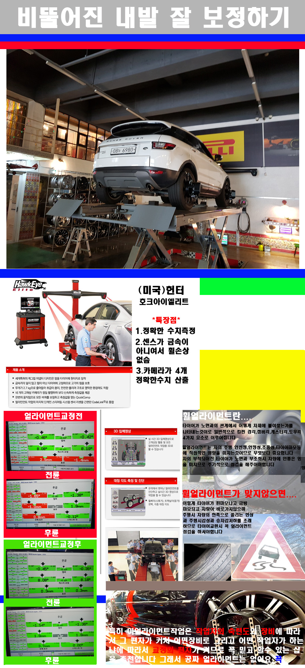 이후 미국 헌터사 호크아이엘리트 장비로 3D얼라이먼트를 진행했습니다 이장비는 현존하는 가장 진화된 얼라이먼트장비입니다 특히 4개의 고성능카메라가 장착되어져 있어 실시간으로 오차가 없는 측정값을 구현하며 바퀴당 각 휠센서 클램프가 프라스틱이며 타이어바닦면을 지지하는 방식이여서 휠의 손상이 없는것이 특징입니다 하지만 장비보다 차량의 얼라이먼트를 볼시 작업자의 정성과 그리고 능력과 숙련도가 관견이기에 꼭 휠얼라이먼트를 장사수단으로 하지않는 샵을 권장합니다 자사는 얼라이먼트정렬시 교정전 교정후를 구분하여 고객님께 직접 이수치값을 확인시켜드리고 작업을 하며 이후 각각의 특성을 가진 타이어들에 대해서 설명 및 관리요령 운전요령 같이 설명해드리고 있습니다 이후 타이어와 휠의 정확한 발란스값과 진동값을 보정후 헌터사 호크아이엘리트 3D얼라이먼트장비로 공장에서 처음 출고될시의 팩토리값으로 교정하였습니다 그리고 타이어질소가스주입기로 3번정도 진공상태로 만든후 질소가스를 주입했습니다 질소가스주입시 가장 관견은 순도이기에 이런 여러번의 진공상태후 주입하고 빼주는 과정를 많이 해주어야합니다 질소가스의 주입시 타이어공기압의 저하가 덜하고 화합물질이 반응을 하지않아 소음전파력과 그리고 타이어안쪽에 수분을 발생하지않으며 타이어안쪽에서의 공기압이 팽창하지않아 타이어에 스트레스를 덜주게 됩니다 하지만 이부분도 공기속에 질소가 80%정도 존재하기에 미미한 차이이지만 질소순도를 높이고 주행시 좋은 점이 확연히 많기에 질소주입을 해드리고 있습니다 특히 고성능타이어나 하중값을 많이 주는 타이어일경우에는 위에서 언급한 부분에서 많이 차이를 보이고 있습니다 이후 타이어왁싱후 출고했습니다+ 감사합니다