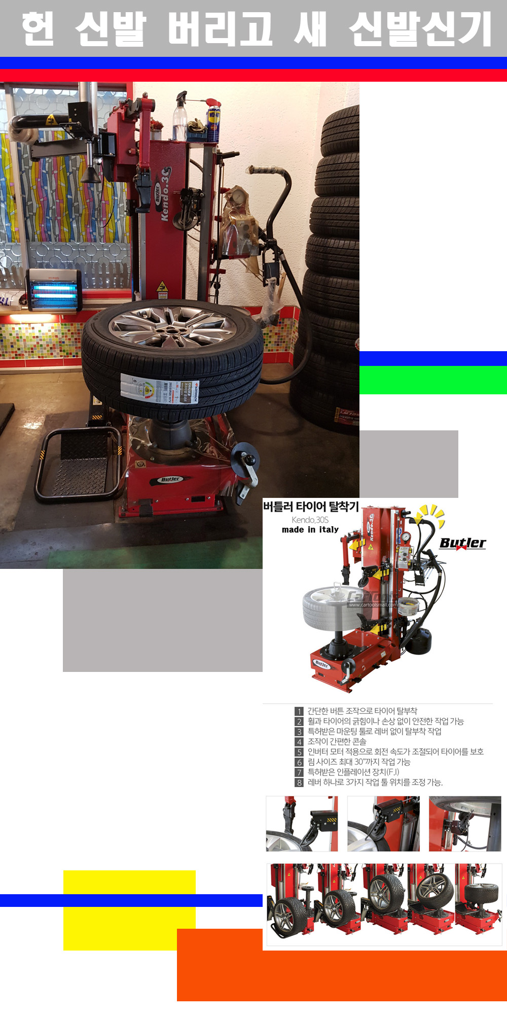 이태리 버틀러사의 켄도3.0S는 휠과 타이어와 조립과 분리시 전혀 제품에 손상을 주지않는 탈착기로 특히 센터락방식(중앙에서 휠를 고정하는 방식)이여서 휠의 중앙부위 잡아서 타이어를 탈부착하고 이후 상하롤러로 타이어를 탈부착합니다 특히 유니포미티작업(휠의 가장가벼운부분과 타이어의 가장 무거운부분을 매칭시키는 작업)시 작업자가 타이어를 정확한 지점에 휠과 매칭시킬수 있는 장점도 있습니다 유니포미티작업 불량시 과도한 진동값으로 핸들링불안 승차감저하 과도한 노면의 충격흡수를 가져와 주행감성을 해치는 첫번째 이유입니다 하지만 이런 작업을 무시하고 그냥 정적인 휠발란스작업만 하는것이 현실입니다 보통 타이어가격만 생각하시고 장착을 하시는데 꼭 이런 부분까지 챙길수 있는 샵을 권장합니다