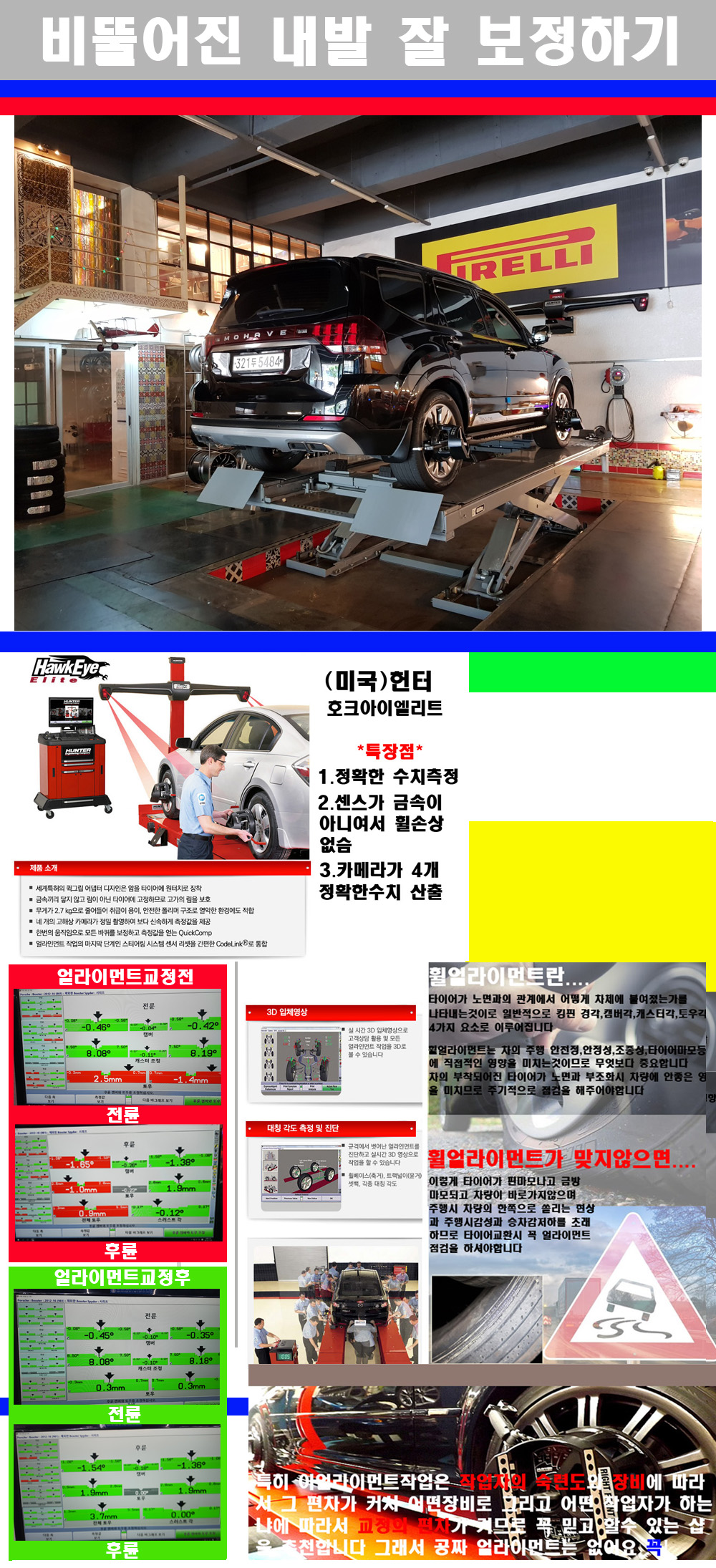 이후 미국 헌터사 호크아이엘리트 장비로 3D얼라이먼트를 진행했습니다 이장비는 현존하는 가장 진화된 얼라이먼트장비입니다 특히 4개의 고성능카메라가 장착되어져 있어 실시간으로 오차가 없는 측정값을 구현하며 바퀴당 각 휠센서 클램프가 프라스틱이며 타이어바닦면을 지지하는 방식이여서 휠의 손상이 없는것이 특징입니다 하지만 장비보다 차량의 얼라이먼트를 볼시 작업자의 정성과 그리고 능력과 숙련도가 관견이기에 꼭 휠얼라이먼트를 장사수단으로 하지않는 샵을 권장합니다 자사는 얼라이먼트정렬시 교정전 교정후를 구분하여 고객님께 직접 이수치값을 확인시켜드리고 작업을 하며 이후 각각의 특성을 가진 타이어들에 대해서 설명 및 관리요령 운전요령 같이 설명해드리고 있습니다 이후 타이어와 휠의 정확한 발란스값과 진동값을 보정후 헌터사 호크아이엘리트 3D얼라이먼트장비로 공장에서 처음 출고될시의 팩토리값으로 교정하였습니다 그리고 타이어질소가스주입기로 3번정도 진공상태로 만든후 질소가스를 주입했습니다 질소가스주입시 가장 관견은 순도이기에 이런 여러번의 진공상태후 주입하고 빼주는 과정를 많이 해주어야합니다 질소가스의 주입시 타이어공기압의 저하가 덜하고 화합물질이 반응을 하지않아 소음전파력과 그리고 타이어안쪽에 수분을 발생하지않으며 타이어안쪽에서의 공기압이 팽창하지않아 타이어에 스트레스를 덜주게 됩니다 하지만 이부분도 공기속에 질소가 80%정도 존재하기에 미미한 차이이지만 질소순도를 높이고 주행시 좋은 점이 확연히 많기에 질소주입을 해드리고 있습니다 특히 고성능타이어나 하중값을 많이 주는 타이어일경우에는 위에서 언급한 부분에서 많이 차이를 보이고 있습니다 이후 타이어왁싱후 출고했습니다+ 감사합니다