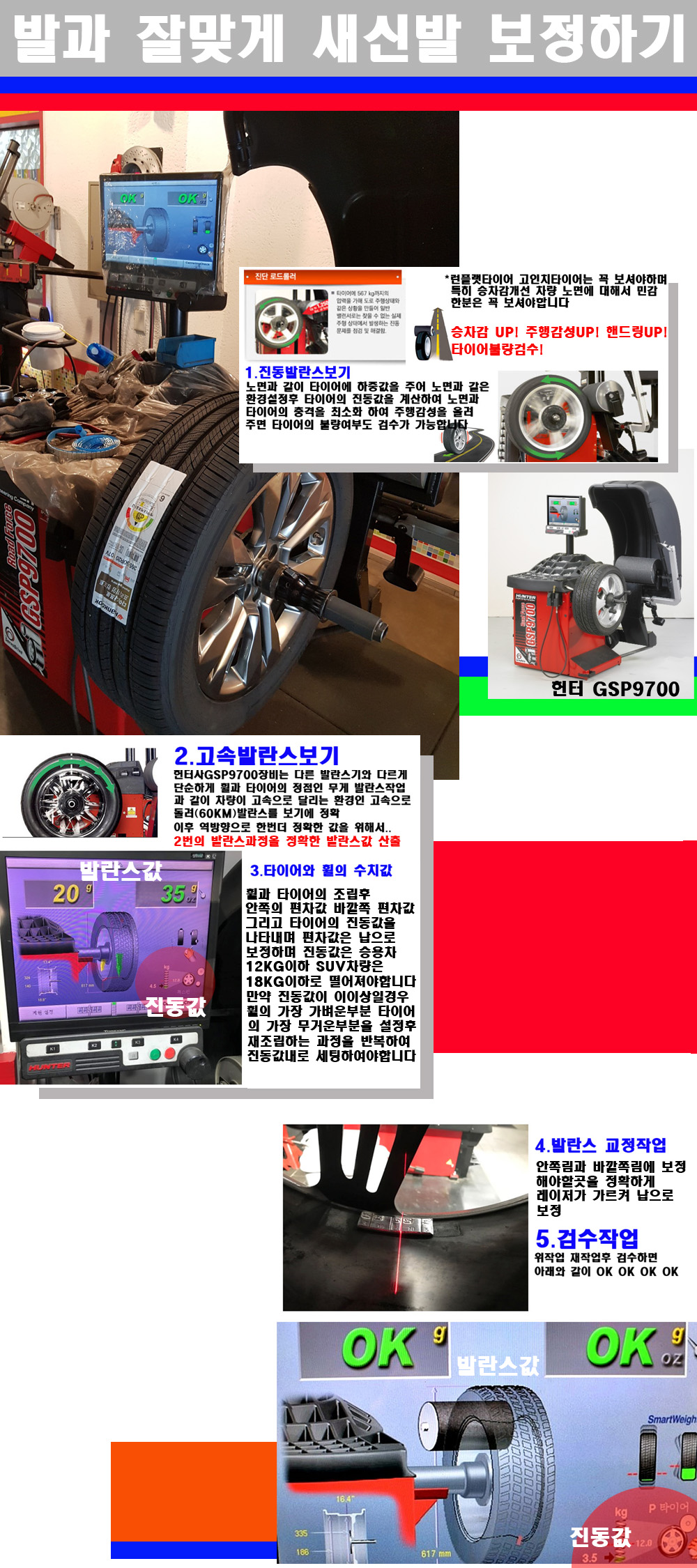 이후 미국 헌터사 GSP9700장비로 고속 및 진동발란스로 더욱더 작업의 정확도와 정밀도를 높였습니다 이장비는 노면에서 올라오는 진동값까지 계산하여 발란스값을 보는 방식으로 진동발란스기는 헌터사GSP9700장비가 유일합니다 이후 역방향으로 60키로의 고속으로 다시 발란스값을 보정하는 방식입니다 그래서 노면에서 올라오는 진동를 잡을수 있으며 특히 타이어의 노면력 측정으로 타이어의 불량여부까지도 검수가 가능한 장비입니다 특히 고속발란스 측정시 타사 발란스기와 틀리게 고속으로 발란스를 보기에 차량이 고속으로 달리는 시뮤레이션 구현이 가능하여 정확한 발란스값을 볼수가 있습니다 그리고 작업자에게는 불필요한 발란스납을 붙이지 않아 미관상으로 좋고 납을 절약하는 고객님에게도윈이고 작업자에게도 윈윈할수 있는 장비입니다 그리고 시중에서 고속진동발란스라고 말하시는 샵들이 많은데 꼭아셔야하는것은 고속발란스는 말그대로 발란스를 볼때 고속으로 돌리기에 60키로 전후 그리고 진동값을 계산하기위해서는 발란스기에 진동롤러가 있어야합니다 그래서 미국헌터사 GSP9700장비가 유일합니다 다른 샵에서 말하는 발란스기는 고속진동발란스기능없는 일반발란스 기기입니다 이점 꼭 아시고 장착하시기를 바랍니다
