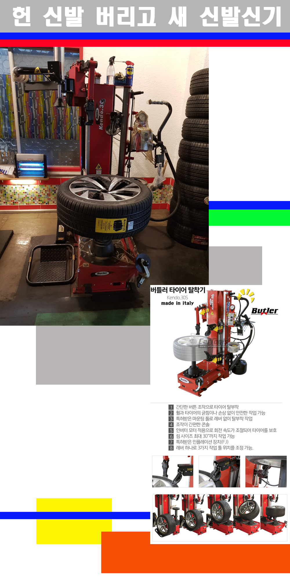 이태리 버틀러사의 켄도3.0S는 휠과 타이어와 조립과 분리시 전혀 제품에 손상을 주지않는 탈착기로 특히 센터락방식(중앙에서 휠를 고정하는 방식)이여서 휠의 중앙부위 잡아서 타이어를 탈부착하고 이후 상하롤러로 타이어를 탈부착합니다 특히 유니포미티작업(휠의 가장가벼운부분과 타이어의 가장 무거운부분을 매칭시키는 작업)시 작업자가 타이어를 정확한 지점에 휠과 매칭시킬수 있는 장점도 있습니다 유니포미티작업 불량시 과도한 진동값으로 핸들링불안 승차감저하 과도한 노면의 충격흡수를 가져와 주행감성을 해치는 첫번째 이유입니다 하지만 이런 작업을 무시하고 그냥 정적인 휠발란스작업만 하는것이 현실입니다 보통 타이어가격만 생각하시고 장착을 하시는데 꼭 이런 부분까지 챙길수 있는 샵을 권장합니다