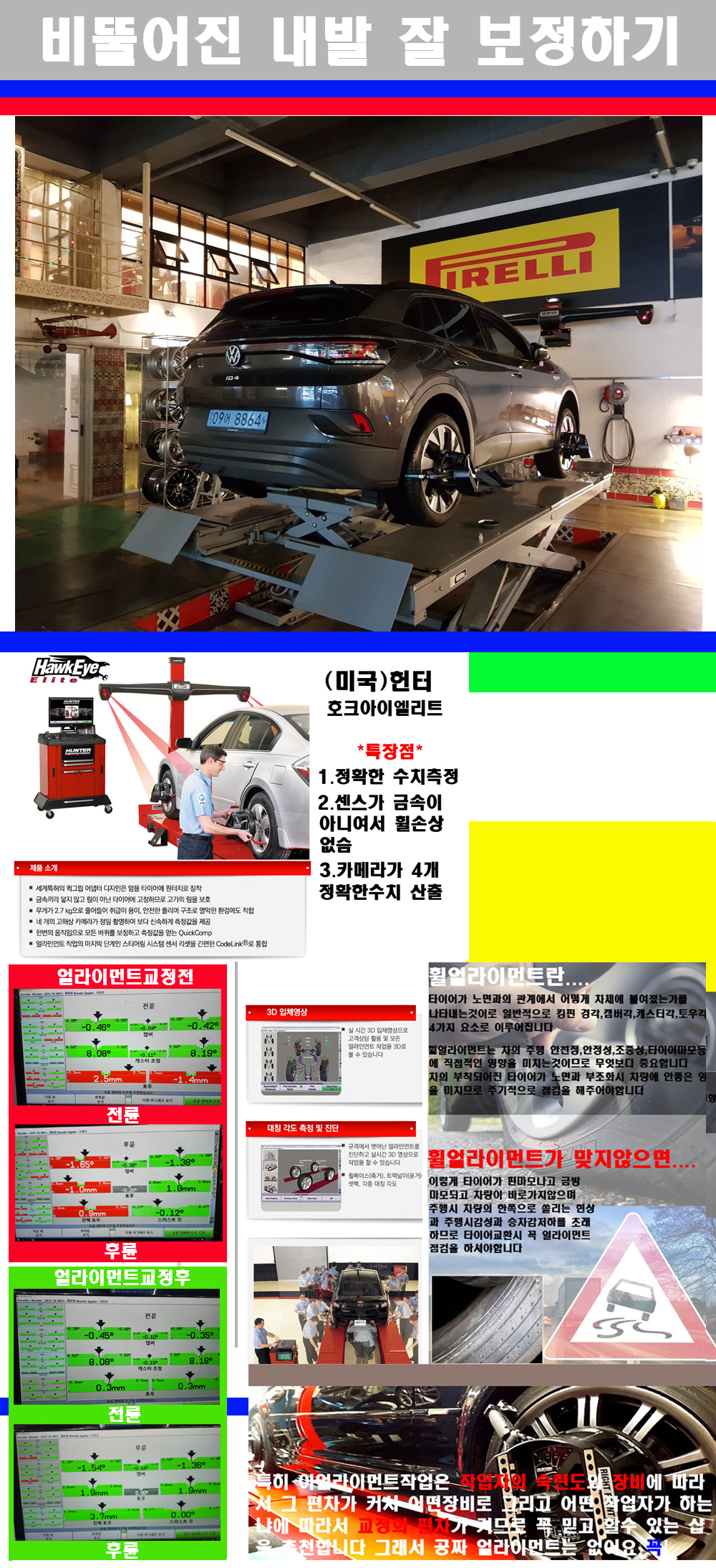 이후 미국 헌터사 호크아이엘리트 장비로 3D얼라이먼트를 진행했습니다 이장비는 현존하는 가장 진화된 얼라이먼트장비입니다 특히 4개의 고성능카메라가 장착되어져 있어 실시간으로 오차가 없는 측정값을 구현하며 바퀴당 각 휠센서 클램프가 프라스틱이며 타이어바닦면을 지지하는 방식이여서 휠의 손상이 없는것이 특징입니다 하지만 장비보다 차량의 얼라이먼트를 볼시 작업자의 정성과 그리고 능력과 숙련도가 관견이기에 꼭 휠얼라이먼트를 장사수단으로 하지않는 샵을 권장합니다 자사는 얼라이먼트정렬시 교정전 교정후를 구분하여 고객님께 직접 이수치값을 확인시켜드리고 작업을 하며 이후 각각의 특성을 가진 타이어들에 대해서 설명 및 관리요령 운전요령 같이 설명해드리고 있습니다 이후 타이어와 휠의 정확한 발란스값과 진동값을 보정후 헌터사 호크아이엘리트 3D얼라이먼트장비로 공장에서 처음 출고될시의 팩토리값으로 교정하였습니다 그리고 타이어질소가스주입기로 3번정도 진공상태로 만든후 질소가스를 주입했습니다 질소가스주입시 가장 관견은 순도이기에 이런 여러번의 진공상태후 주입하고 빼주는 과정를 많이 해주어야합니다 질소가스의 주입시 타이어공기압의 저하가 덜하고 화합물질이 반응을 하지않아 소음전파력과 그리고 타이어안쪽에 수분을 발생하지않으며 타이어안쪽에서의 공기압이 팽창하지않아 타이어에 스트레스를 덜주게 됩니다 하지만 이부분도 공기속에 질소가 80%정도 존재하기에 미미한 차이이지만 질소순도를 높이고 주행시 좋은 점이 확연히 많기에 질소주입을 해드리고 있습니다 특히 고성능타이어나 하중값을 많이 주는 타이어일경우에는 위에서 언급한 부분에서 많이 차이를 보이고 있습니다 이후 타이어왁싱후 출고했습니다+ 감사합니다 |