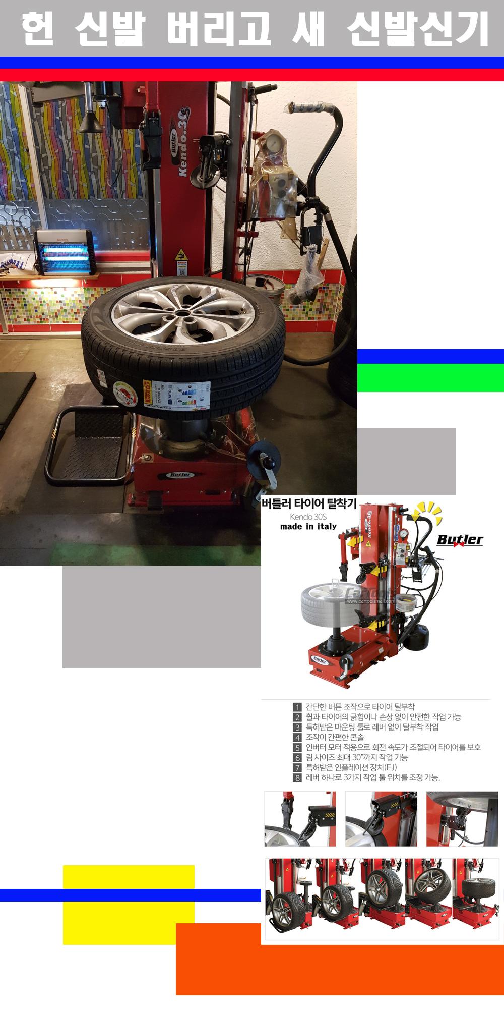 이태리 버틀러사의 켄도3.0S는 휠과 타이어와 조립과 분리시 전혀 제품에 손상을 주지않는 탈착기로 특히 센터락방식(중앙에서 휠를 고정하는 방식)이여서 휠의 중앙부위 잡아서 타이어를 탈부착하고 이후 상하롤러로 타이어를 탈부착합니다 특히 유니포미티작업(휠의 가장가벼운부분과 타이어의 가장 무거운부분을 매칭시키는 작업)시 작업자가 타이어를 정확한 지점에 휠과 매칭시킬수 있는 장점도 있습니다 유니포미티작업 불량시 과도한 진동값으로 핸들링불안 승차감저하 과도한 노면의 충격흡수를 가져와 주행감성을 해치는 첫번째 이유입니다 하지만 이런 작업을 무시하고 그냥 정적인 휠발란스작업만 하는것이 현실입니다 보통 타이어가격만 생각하시고 장착을 하시는데 꼭 이런 부분까지 챙길수 있는 샵을 권장합니다