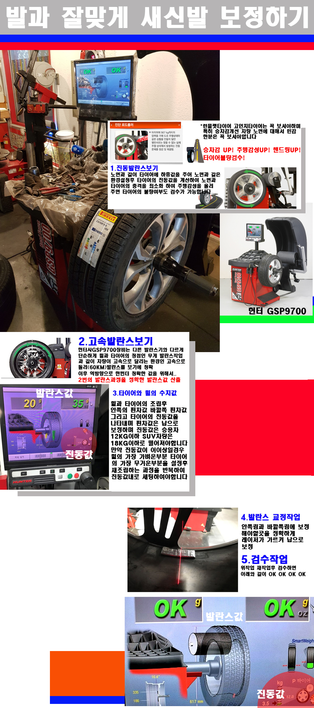 이후 미국 헌터사 GSP9700장비로 고속 및 진동발란스로 더욱더 작업의 정확도와 정밀도를 높였습니다 이장비는 노면에서 올라오는 진동값까지 계산하여 발란스값을 보는 방식으로 진동발란스기는 헌터사GSP9700장비가 유일합니다 이후 역방향으로 60키로의 고속으로 다시 발란스값을 보정하는 방식입니다 그래서 노면에서 올라오는 진동를 잡을수 있으며 특히 타이어의 노면력 측정으로 타이어의 불량여부까지도 검수가 가능한 장비입니다 특히 고속발란스 측정시 타사 발란스기와 틀리게 고속으로 발란스를 보기에 차량이 고속으로 달리는 시뮤레이션 구현이 가능하여 정확한 발란스값을 볼수가 있습니다 그리고 작업자에게는 불필요한 발란스납을 붙이지 않아 미관상으로 좋고 납을 절약하는 고객님에게도윈이고 작업자에게도 윈윈할수 있는 장비입니다 그리고 시중에서 고속진동발란스라고 말하시는 샵들이 많은데 꼭아셔야하는것은 고속발란스는 말그대로 발란스를 볼때 고속으로 돌리기에 60키로 전후 그리고 진동값을 계산하기위해서는 발란스기에 진동롤러가 있어야합니다 그래서 미국헌터사 GSP9700장비가 유일합니다 다른 샵에서 말하는 발란스기는 고속진동발란스기능없는 일반발란스 기기입니다 이점 꼭 아시고 장착하시기를 바랍니다