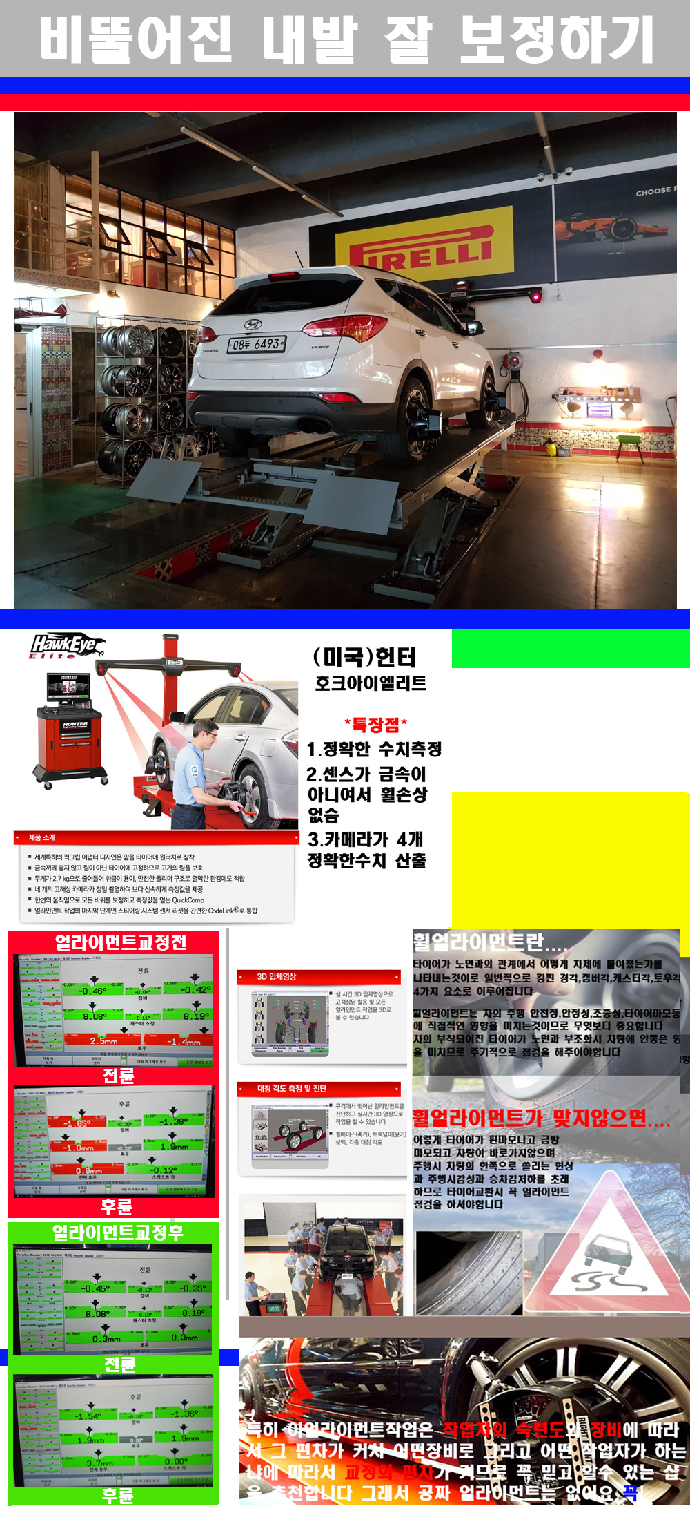 이후 미국 헌터사 호크아이엘리트 장비로 3D얼라이먼트를 진행했습니다 이장비는 현존하는 가장 진화된 얼라이먼트장비입니다 특히 4개의 고성능카메라가 장착되어져 있어 실시간으로 오차가 없는 측정값을 구현하며 바퀴당 각 휠센서 클램프가 프라스틱이며 타이어바닦면을 지지하는 방식이여서 휠의 손상이 없는것이 특징입니다 하지만 장비보다 차량의 얼라이먼트를 볼시 작업자의 정성과 그리고 능력과 숙련도가 관견이기에 꼭 휠얼라이먼트를 장사수단으로 하지않는 샵을 권장합니다 자사는 얼라이먼트정렬시 교정전 교정후를 구분하여 고객님께 직접 이수치값을 확인시켜드리고 작업을 하며 이후 각각의 특성을 가진 타이어들에 대해서 설명 및 관리요령 운전요령 같이 설명해드리고 있습니다 이후 타이어와 휠의 정확한 발란스값과 진동값을 보정후 헌터사 호크아이엘리트 3D얼라이먼트장비로 공장에서 처음 출고될시의 팩토리값으로 교정하였습니다 그리고 타이어질소가스주입기로 3번정도 진공상태로 만든후 질소가스를 주입했습니다 질소가스주입시 가장 관견은 순도이기에 이런 여러번의 진공상태후 주입하고 빼주는 과정를 많이 해주어야합니다 질소가스의 주입시 타이어공기압의 저하가 덜하고 화합물질이 반응을 하지않아 소음전파력과 그리고 타이어안쪽에 수분을 발생하지않으며 타이어안쪽에서의 공기압이 팽창하지않아 타이어에 스트레스를 덜주게 됩니다 하지만 이부분도 공기속에 질소가 80%정도 존재하기에 미미한 차이이지만 질소순도를 높이고 주행시 좋은 점이 확연히 많기에 질소주입을 해드리고 있습니다 특히 고성능타이어나 하중값을 많이 주는 타이어일경우에는 위에서 언급한 부분에서 많이 차이를 보이고 있습니다 이후 타이어왁싱후 출고했습니다+ 감사합니다 |