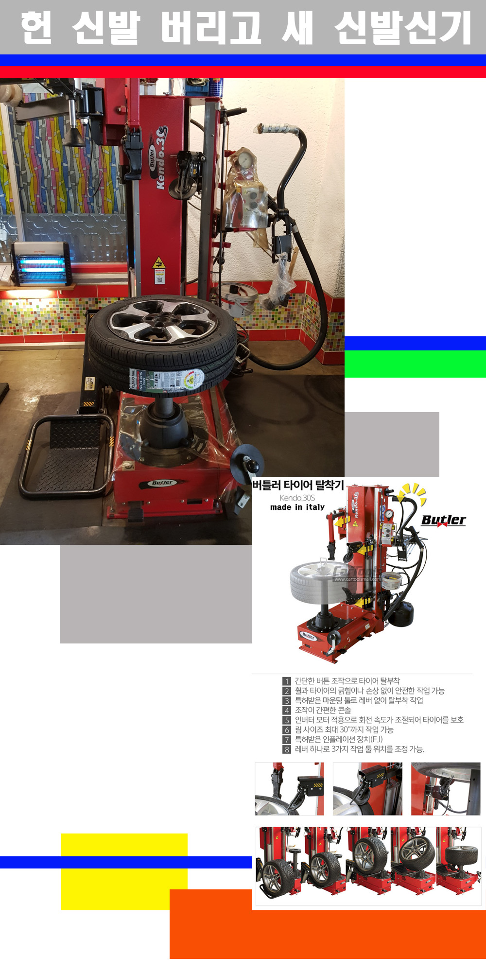 이태리 버틀러사의 켄도3.0S는 휠과 타이어와 조립과 분리시 전혀 제품에 손상을 주지않는 탈착기로 특히 센터락방식(중앙에서 휠를 고정하는 방식)이여서 휠의 중앙부위 잡아서 타이어를 탈부착하고 이후 상하롤러로 타이어를 탈부착합니다 특히 유니포미티작업(휠의 가장가벼운부분과 타이어의 가장 무거운부분을 매칭시키는 작업)시 작업자가 타이어를 정확한 지점에 휠과 매칭시킬수 있는 장점도 있습니다 유니포미티작업 불량시 과도한 진동값으로 핸들링불안 승차감저하 과도한 노면의 충격흡수를 가져와 주행감성을 해치는 첫번째 이유입니다 하지만 이런 작업을 무시하고 그냥 정적인 휠발란스작업만 하는것이 현실입니다 보통 타이어가격만 생각하시고 장착을 하시는데 꼭 이런 부분까지 챙길수 있는 샵을 권장합니다