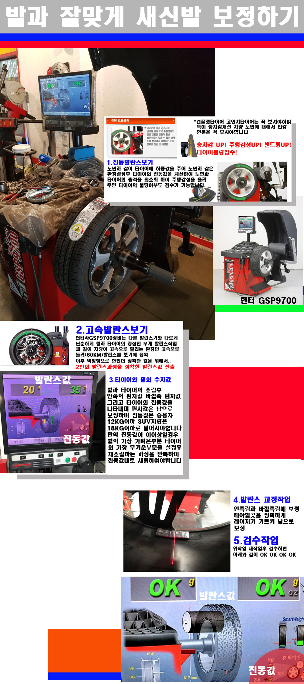 이후 미국 헌터사 GSP9700장비로 고속 및 진동발란스로 더욱더 작업의 정확도와 정밀도를 높였습니다 이장비는 노면에서 올라오는 진동값까지 계산하여 발란스값을 보는 방식으로 진동발란스기는 헌터사GSP9700장비가 유일합니다 이후 역방향으로 60키로의 고속으로 다시 발란스값을 보정하는 방식입니다 그래서 노면에서 올라오는 진동를 잡을수 있으며 특히 타이어의 노면력 측정으로 타이어의 불량여부까지도 검수가 가능한 장비입니다 특히 고속발란스 측정시 타사 발란스기와 틀리게 고속으로 발란스를 보기에 차량이 고속으로 달리는 시뮤레이션 구현이 가능하여 정확한 발란스값을 볼수가 있습니다 그리고 작업자에게는 불필요한 발란스납을 붙이지 않아 미관상으로 좋고 납을 절약하는 고객님에게도윈이고 작업자에게도 윈윈할수 있는 장비입니다 그리고 시중에서 고속진동발란스라고 말하시는 샵들이 많은데 꼭아셔야하는것은 고속발란스는 말그대로 발란스를 볼때 고속으로 돌리기에 60키로 전후 그리고 진동값을 계산하기위해서는 발란스기에 진동롤러가 있어야합니다 그래서 미국헌터사 GSP9700장비가 유일합니다 다른 샵에서 말하는 발란스기는 고속진동발란스기능없는 일반발란스 기기입니다 이점 꼭 아시고 장착하시기를 바랍니다
