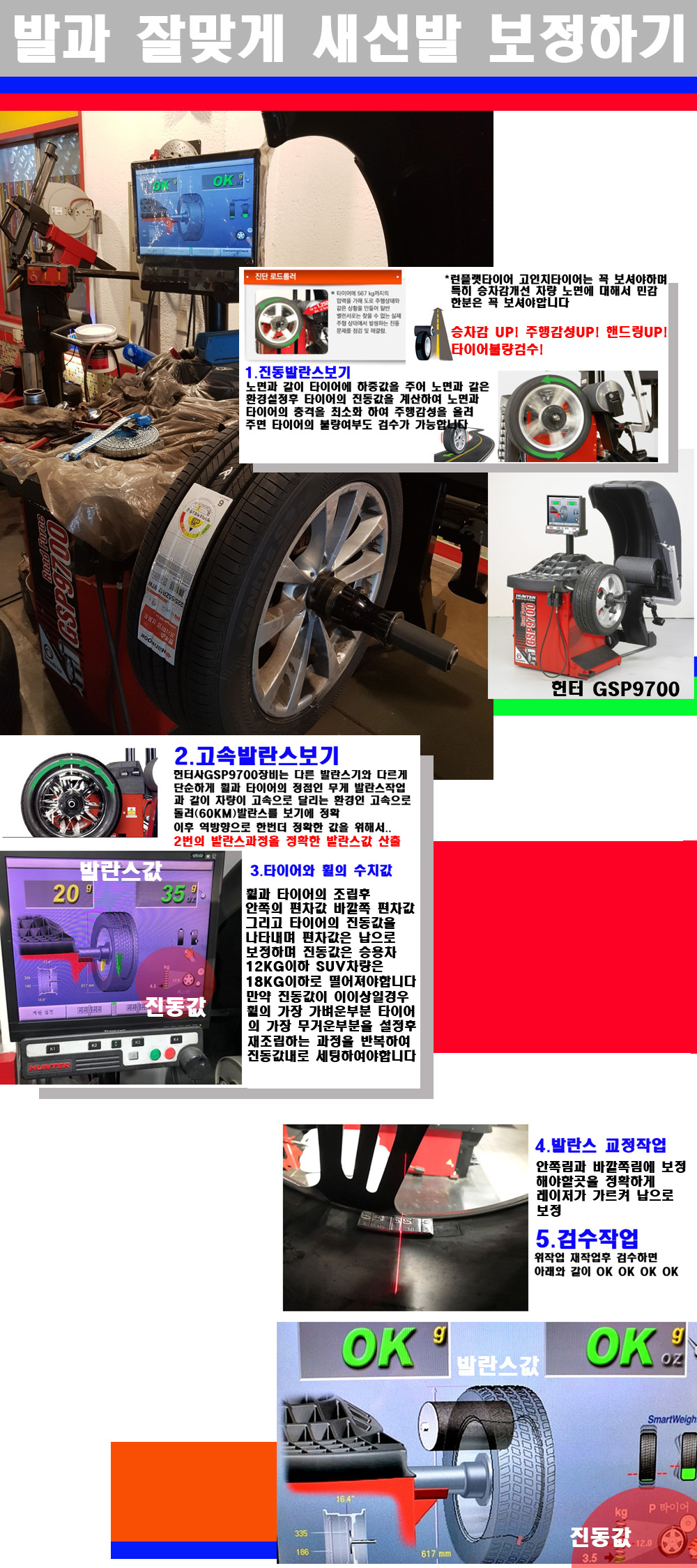 이후 미국 헌터사 GSP9700장비로 고속 및 진동발란스로 더욱더 작업의 정확도와 정밀도를 높였습니다 이장비는 노면에서 올라오는 진동값까지 계산하여 발란스값을 보는 방식으로 진동발란스기는 헌터사GSP9700장비가 유일합니다 이후 역방향으로 60키로의 고속으로 다시 발란스값을 보정하는 방식입니다 그래서 노면에서 올라오는 진동를 잡을수 있으며 특히 타이어의 노면력 측정으로 타이어의 불량여부까지도 검수가 가능한 장비입니다 특히 고속발란스 측정시 타사 발란스기와 틀리게 고속으로 발란스를 보기에 차량이 고속으로 달리는 시뮤레이션 구현이 가능하여 정확한 발란스값을 볼수가 있습니다 그리고 작업자에게는 불필요한 발란스납을 붙이지 않아 미관상으로 좋고 납을 절약하는 고객님에게도윈이고 작업자에게도 윈윈할수 있는 장비입니다 그리고 시중에서 고속진동발란스라고 말하시는 샵들이 많은데 꼭아셔야하는것은 고속발란스는 말그대로 발란스를 볼때 고속으로 돌리기에 60키로 전후 그리고 진동값을 계산하기위해서는 발란스기에 진동롤러가 있어야합니다 그래서 미국헌터사 GSP9700장비가 유일합니다 다른 샵에서 말하는 발란스기는 고속진동발란스기능없는 일반발란스 기기입니다 이점 꼭 아시고 장착하시기를 바랍니다