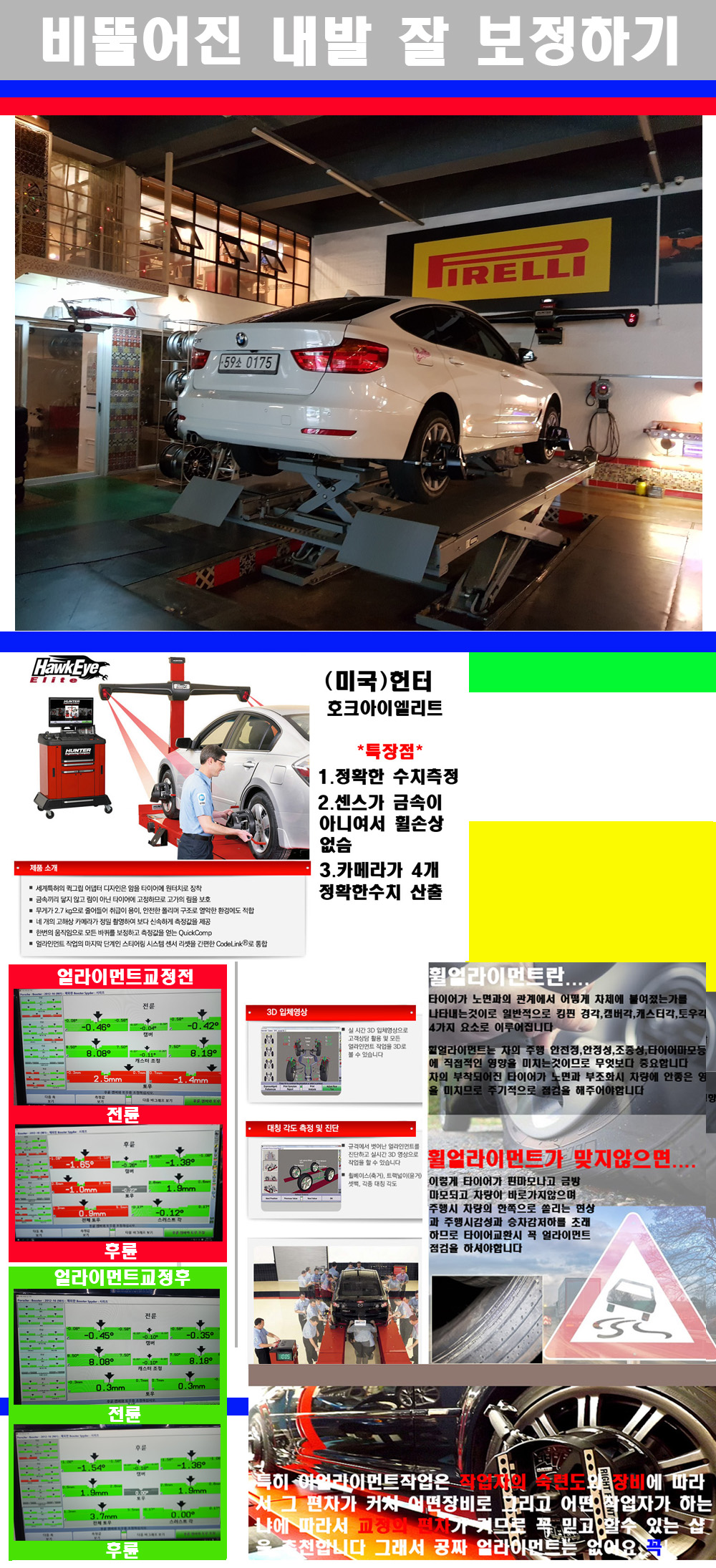 이후 미국 헌터사 호크아이엘리트 장비로 3D얼라이먼트를 진행했습니다 이장비는 현존하는 가장 진화된 얼라이먼트장비입니다 특히 4개의 고성능카메라가 장착되어져 있어 실시간으로 오차가 없는 측정값을 구현하며 바퀴당 각 휠센서 클램프가 프라스틱이며 타이어바닦면을 지지하는 방식이여서 휠의 손상이 없는것이 특징입니다 하지만 장비보다 차량의 얼라이먼트를 볼시 작업자의 정성과 그리고 능력과 숙련도가 관견이기에 꼭 휠얼라이먼트를 장사수단으로 하지않는 샵을 권장합니다 자사는 얼라이먼트정렬시 교정전 교정후를 구분하여 고객님께 직접 이수치값을 확인시켜드리고 작업을 하며 이후 각각의 특성을 가진 타이어들에 대해서 설명 및 관리요령 운전요령 같이 설명해드리고 있습니다 이후 타이어와 휠의 정확한 발란스값과 진동값을 보정후 헌터사 호크아이엘리트 3D얼라이먼트장비로 공장에서 처음 출고될시의 팩토리값으로 교정하였습니다 그리고 타이어질소가스주입기로 3번정도 진공상태로 만든후 질소가스를 주입했습니다 질소가스주입시 가장 관견은 순도이기에 이런 여러번의 진공상태후 주입하고 빼주는 과정를 많이 해주어야합니다 질소가스의 주입시 타이어공기압의 저하가 덜하고 화합물질이 반응을 하지않아 소음전파력과 그리고 타이어안쪽에 수분을 발생하지않으며 타이어안쪽에서의 공기압이 팽창하지않아 타이어에 스트레스를 덜주게 됩니다 하지만 이부분도 공기속에 질소가 80%정도 존재하기에 미미한 차이이지만 질소순도를 높이고 주행시 좋은 점이 확연히 많기에 질소주입을 해드리고 있습니다 특히 고성능타이어나 하중값을 많이 주는 타이어일경우에는 위에서 언급한 부분에서 많이 차이를 보이고 있습니다 이후 타이어왁싱후 출고했습니다+ 감사합니다 |