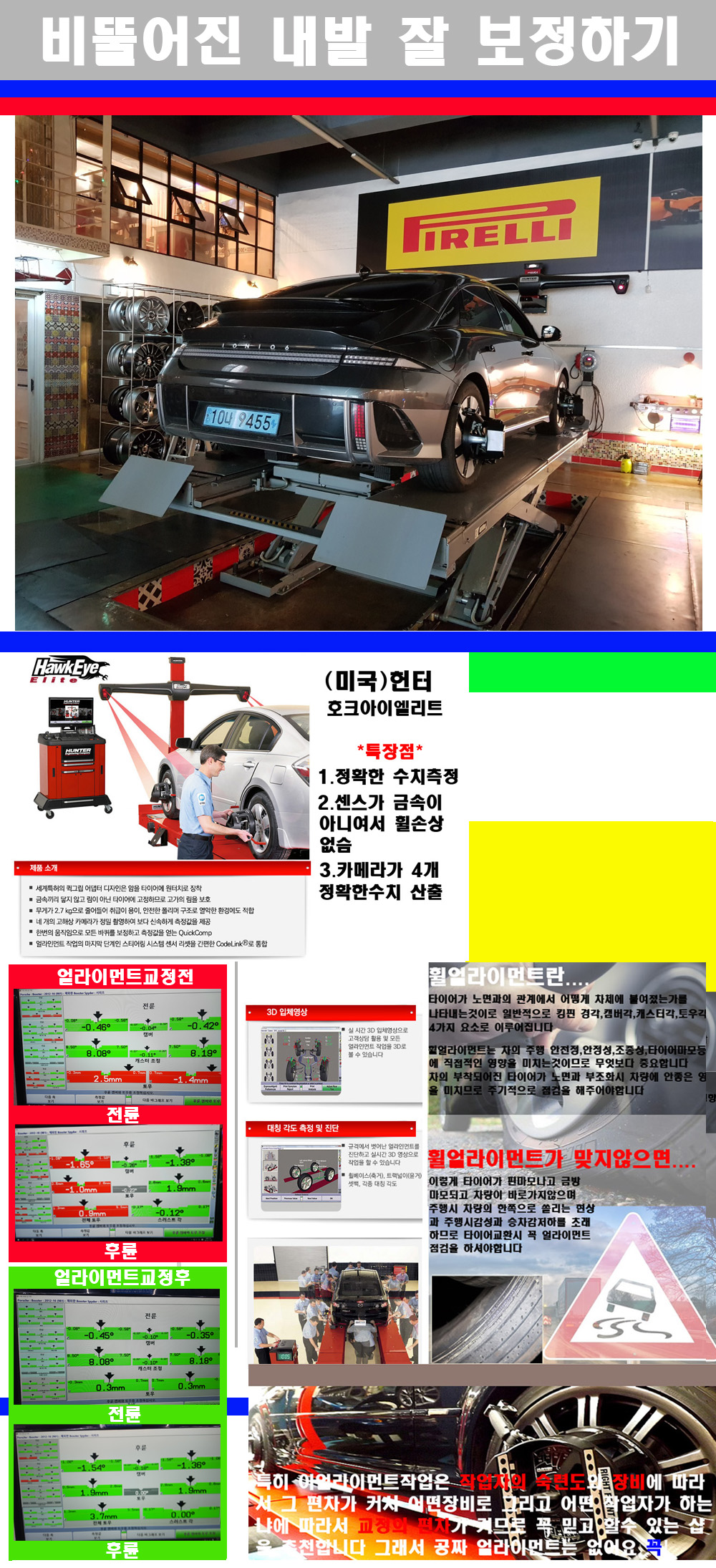 이후 미국 헌터사 호크아이엘리트 장비로 3D얼라이먼트를 진행했습니다 이장비는 현존하는 가장 진화된 얼라이먼트장비입니다 특히 4개의 고성능카메라가 장착되어져 있어 실시간으로 오차가 없는 측정값을 구현하며 바퀴당 각 휠센서 클램프가 프라스틱이며 타이어바닦면을 지지하는 방식이여서 휠의 손상이 없는것이 특징입니다 하지만 장비보다 차량의 얼라이먼트를 볼시 작업자의 정성과 그리고 능력과 숙련도가 관견이기에 꼭 휠얼라이먼트를 장사수단으로 하지않는 샵을 권장합니다 자사는 얼라이먼트정렬시 교정전 교정후를 구분하여 고객님께 직접 이수치값을 확인시켜드리고 작업을 하며 이후 각각의 특성을 가진 타이어들에 대해서 설명 및 관리요령 운전요령 같이 설명해드리고 있습니다 이후 타이어와 휠의 정확한 발란스값과 진동값을 보정후 헌터사 호크아이엘리트 3D얼라이먼트장비로 공장에서 처음 출고될시의 팩토리값으로 교정하였습니다 그리고 타이어질소가스주입기로 3번정도 진공상태로 만든후 질소가스를 주입했습니다 질소가스주입시 가장 관견은 순도이기에 이런 여러번의 진공상태후 주입하고 빼주는 과정를 많이 해주어야합니다 질소가스의 주입시 타이어공기압의 저하가 덜하고 화합물질이 반응을 하지않아 소음전파력과 그리고 타이어안쪽에 수분을 발생하지않으며 타이어안쪽에서의 공기압이 팽창하지않아 타이어에 스트레스를 덜주게 됩니다 하지만 이부분도 공기속에 질소가 80%정도 존재하기에 미미한 차이이지만 질소순도를 높이고 주행시 좋은 점이 확연히 많기에 질소주입을 해드리고 있습니다 특히 고성능타이어나 하중값을 많이 주는 타이어일경우에는 위에서 언급한 부분에서 많이 차이를 보이고 있습니다 이후 타이어왁싱후 출고했습니다+ 감사합니다 |