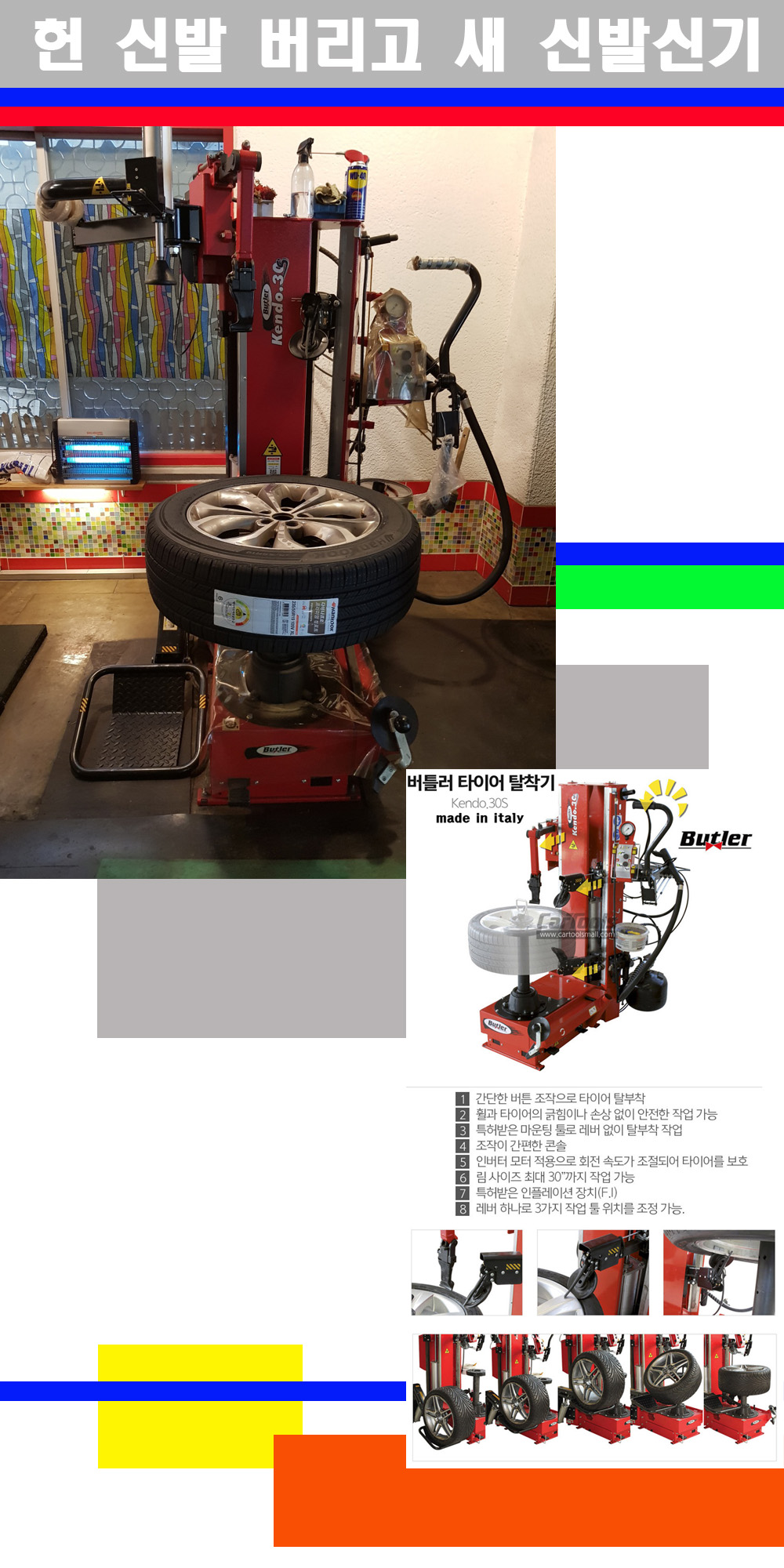 이태리 버틀러사의 켄도3.0S는 휠과 타이어와 조립과 분리시 전혀 제품에 손상을 주지않는 탈착기로 특히 센터락방식(중앙에서 휠를 고정하는 방식)이여서 휠의 중앙부위 잡아서 타이어를 탈부착하고 이후 상하롤러로 타이어를 탈부착합니다 특히 유니포미티작업(휠의 가장가벼운부분과 타이어의 가장 무거운부분을 매칭시키는 작업)시 작업자가 타이어를 정확한 지점에 휠과 매칭시킬수 있는 장점도 있습니다 유니포미티작업 불량시 과도한 진동값으로 핸들링불안 승차감저하 과도한 노면의 충격흡수를 가져와 주행감성을 해치는 첫번째 이유입니다 하지만 이런 작업을 무시하고 그냥 정적인 휠발란스작업만 하는것이 현실입니다 보통 타이어가격만 생각하시고 장착을 하시는데 꼭 이런 부분까지 챙길수 있는 샵을 권장합니다