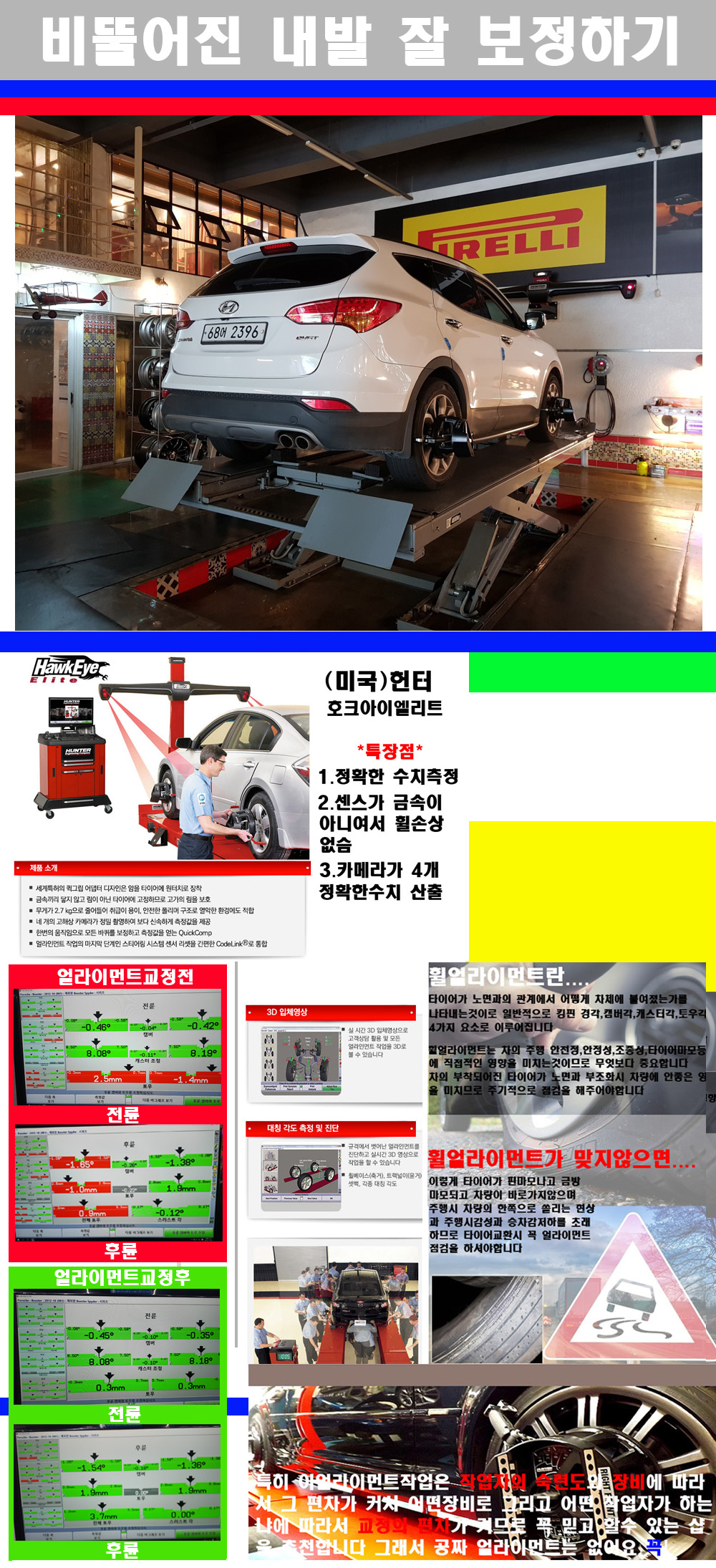 이후 미국 헌터사 호크아이엘리트 장비로 3D얼라이먼트를 진행했습니다 이장비는 현존하는 가장 진화된 얼라이먼트장비입니다 특히 4개의 고성능카메라가 장착되어져 있어 실시간으로 오차가 없는 측정값을 구현하며 바퀴당 각 휠센서 클램프가 프라스틱이며 타이어바닦면을 지지하는 방식이여서 휠의 손상이 없는것이 특징입니다 하지만 장비보다 차량의 얼라이먼트를 볼시 작업자의 정성과 그리고 능력과 숙련도가 관견이기에 꼭 휠얼라이먼트를 장사수단으로 하지않는 샵을 권장합니다 자사는 얼라이먼트정렬시 교정전 교정후를 구분하여 고객님께 직접 이수치값을 확인시켜드리고 작업을 하며 이후 각각의 특성을 가진 타이어들에 대해서 설명 및 관리요령 운전요령 같이 설명해드리고 있습니다 이후 타이어와 휠의 정확한 발란스값과 진동값을 보정후 헌터사 호크아이엘리트 3D얼라이먼트장비로 공장에서 처음 출고될시의 팩토리값으로 교정하였습니다 그리고 타이어질소가스주입기로 3번정도 진공상태로 만든후 질소가스를 주입했습니다 질소가스주입시 가장 관견은 순도이기에 이런 여러번의 진공상태후 주입하고 빼주는 과정를 많이 해주어야합니다 질소가스의 주입시 타이어공기압의 저하가 덜하고 화합물질이 반응을 하지않아 소음전파력과 그리고 타이어안쪽에 수분을 발생하지않으며 타이어안쪽에서의 공기압이 팽창하지않아 타이어에 스트레스를 덜주게 됩니다 하지만 이부분도 공기속에 질소가 80%정도 존재하기에 미미한 차이이지만 질소순도를 높이고 주행시 좋은 점이 확연히 많기에 질소주입을 해드리고 있습니다 특히 고성능타이어나 하중값을 많이 주는 타이어일경우에는 위에서 언급한 부분에서 많이 차이를 보이고 있습니다 이후 타이어왁싱후 출고했습니다+ 감사합니다 |