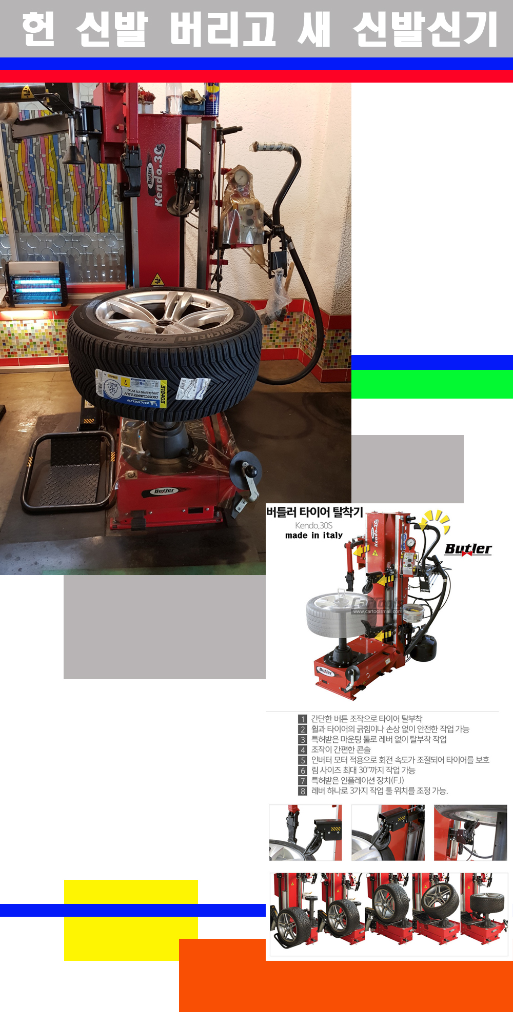 이태리 버틀러사의 켄도3.0S는 휠과 타이어와 조립과 분리시 전혀 제품에 손상을 주지않는 탈착기로 특히 센터락방식(중앙에서 휠를 고정하는 방식)이여서 휠의 중앙부위 잡아서 타이어를 탈부착하고 이후 상하롤러로 타이어를 탈부착합니다 특히 유니포미티작업(휠의 가장가벼운부분과 타이어의 가장 무거운부분을 매칭시키는 작업)시 작업자가 타이어를 정확한 지점에 휠과 매칭시킬수 있는 장점도 있습니다 유니포미티작업 불량시 과도한 진동값으로 핸들링불안 승차감저하 과도한 노면의 충격흡수를 가져와 주행감성을 해치는 첫번째 이유입니다 하지만 이런 작업을 무시하고 그냥 정적인 휠발란스작업만 하는것이 현실입니다 보통 타이어가격만 생각하시고 장착을 하시는데 꼭 이런 부분까지 챙길수 있는 샵을 권장합니다