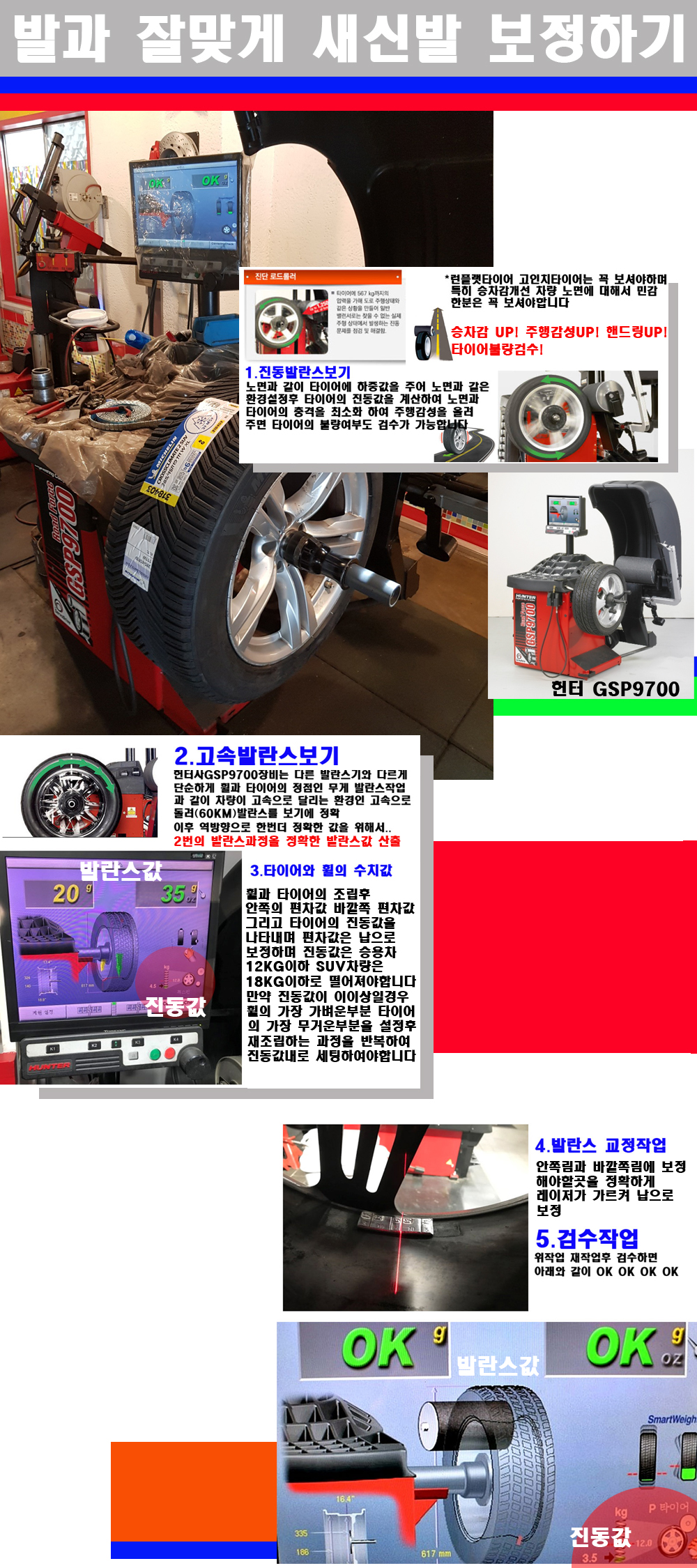 이후 미국 헌터사 GSP9700장비로 고속 및 진동발란스로 더욱더 작업의 정확도와 정밀도를 높였습니다 이장비는 노면에서 올라오는 진동값까지 계산하여 발란스값을 보는 방식으로 진동발란스기는 헌터사GSP9700장비가 유일합니다 이후 역방향으로 60키로의 고속으로 다시 발란스값을 보정하는 방식입니다 그래서 노면에서 올라오는 진동를 잡을수 있으며 특히 타이어의 노면력 측정으로 타이어의 불량여부까지도 검수가 가능한 장비입니다 특히 고속발란스 측정시 타사 발란스기와 틀리게 고속으로 발란스를 보기에 차량이 고속으로 달리는 시뮤레이션 구현이 가능하여 정확한 발란스값을 볼수가 있습니다 그리고 작업자에게는 불필요한 발란스납을 붙이지 않아 미관상으로 좋고 납을 절약하는 고객님에게도윈이고 작업자에게도 윈윈할수 있는 장비입니다 그리고 시중에서 고속진동발란스라고 말하시는 샵들이 많은데 꼭아셔야하는것은 고속발란스는 말그대로 발란스를 볼때 고속으로 돌리기에 60키로 전후 그리고 진동값을 계산하기위해서는 발란스기에 진동롤러가 있어야합니다 그래서 미국헌터사 GSP9700장비가 유일합니다 다른 샵에서 말하는 발란스기는 고속진동발란스기능없는 일반발란스 기기입니다 이점 꼭 아시고 장착하시기를 바랍니다