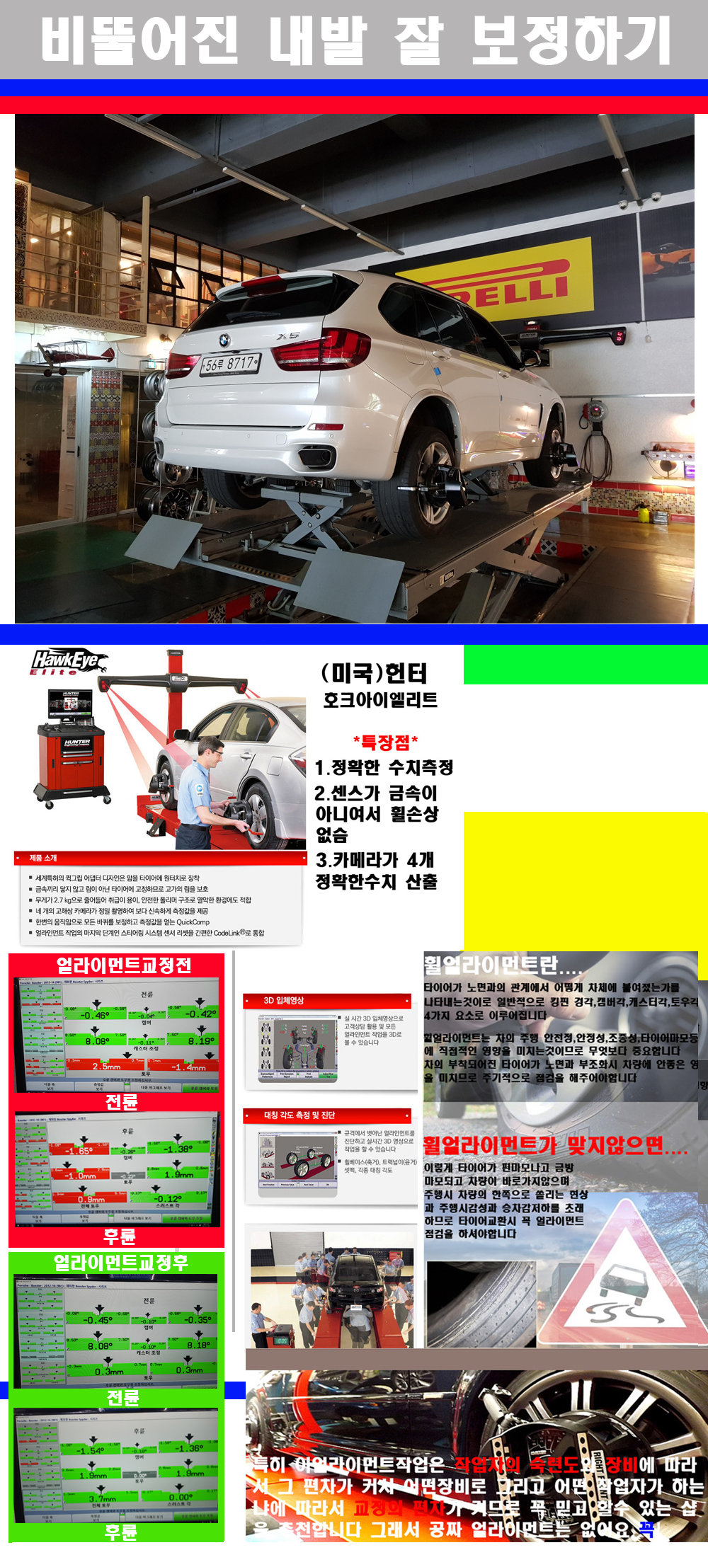이후 미국 헌터사 호크아이엘리트 장비로 3D얼라이먼트를 진행했습니다 이장비는 현존하는 가장 진화된 얼라이먼트장비입니다 특히 4개의 고성능카메라가 장착되어져 있어 실시간으로 오차가 없는 측정값을 구현하며 바퀴당 각 휠센서 클램프가 프라스틱이며 타이어바닦면을 지지하는 방식이여서 휠의 손상이 없는것이 특징입니다 하지만 장비보다 차량의 얼라이먼트를 볼시 작업자의 정성과 그리고 능력과 숙련도가 관견이기에 꼭 휠얼라이먼트를 장사수단으로 하지않는 샵을 권장합니다 자사는 얼라이먼트정렬시 교정전 교정후를 구분하여 고객님께 직접 이수치값을 확인시켜드리고 작업을 하며 이후 각각의 특성을 가진 타이어들에 대해서 설명 및 관리요령 운전요령 같이 설명해드리고 있습니다 이후 타이어와 휠의 정확한 발란스값과 진동값을 보정후 헌터사 호크아이엘리트 3D얼라이먼트장비로 공장에서 처음 출고될시의 팩토리값으로 교정하였습니다 그리고 타이어질소가스주입기로 3번정도 진공상태로 만든후 질소가스를 주입했습니다 질소가스주입시 가장 관견은 순도이기에 이런 여러번의 진공상태후 주입하고 빼주는 과정를 많이 해주어야합니다 질소가스의 주입시 타이어공기압의 저하가 덜하고 화합물질이 반응을 하지않아 소음전파력과 그리고 타이어안쪽에 수분을 발생하지않으며 타이어안쪽에서의 공기압이 팽창하지않아 타이어에 스트레스를 덜주게 됩니다 하지만 이부분도 공기속에 질소가 80%정도 존재하기에 미미한 차이이지만 질소순도를 높이고 주행시 좋은 점이 확연히 많기에 질소주입을 해드리고 있습니다 특히 고성능타이어나 하중값을 많이 주는 타이어일경우에는 위에서 언급한 부분에서 많이 차이를 보이고 있습니다 이후 타이어왁싱후 출고했습니다+ 감사합니다 |