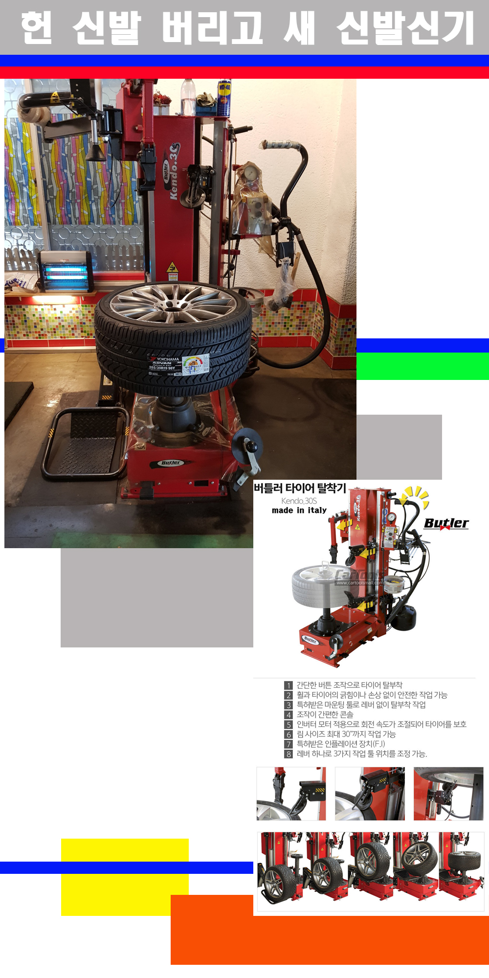이태리 버틀러사의 켄도3.0S는 휠과 타이어와 조립과 분리시 전혀 제품에 손상을 주지않는 탈착기로 특히 센터락방식(중앙에서 휠를 고정하는 방식)이여서 휠의 중앙부위 잡아서 타이어를 탈부착하고 이후 상하롤러로 타이어를 탈부착합니다 특히 유니포미티작업(휠의 가장가벼운부분과 타이어의 가장 무거운부분을 매칭시키는 작업)시 작업자가 타이어를 정확한 지점에 휠과 매칭시킬수 있는 장점도 있습니다 유니포미티작업 불량시 과도한 진동값으로 핸들링불안 승차감저하 과도한 노면의 충격흡수를 가져와 주행감성을 해치는 첫번째 이유입니다 하지만 이런 작업을 무시하고 그냥 정적인 휠발란스작업만 하는것이 현실입니다 보통 타이어가격만 생각하시고 장착을 하시는데 꼭 이런 부분까지 챙길수 있는 샵을 권장합니다