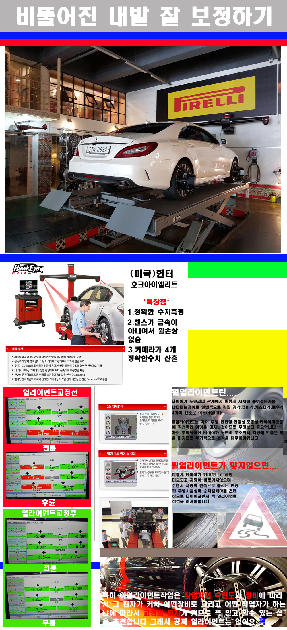 이후 미국 헌터사 호크아이엘리트 장비로 3D얼라이먼트를 진행했습니다 이장비는 현존하는 가장 진화된 얼라이먼트장비입니다 특히 4개의 고성능카메라가 장착되어져 있어 실시간으로 오차가 없는 측정값을 구현하며 바퀴당 각 휠센서 클램프가 프라스틱이며 타이어바닦면을 지지하는 방식이여서 휠의 손상이 없는것이 특징입니다 하지만 장비보다 차량의 얼라이먼트를 볼시 작업자의 정성과 그리고 능력과 숙련도가 관견이기에 꼭 휠얼라이먼트를 장사수단으로 하지않는 샵을 권장합니다 자사는 얼라이먼트정렬시 교정전 교정후를 구분하여 고객님께 직접 이수치값을 확인시켜드리고 작업을 하며 이후 각각의 특성을 가진 타이어들에 대해서 설명 및 관리요령 운전요령 같이 설명해드리고 있습니다 이후 타이어와 휠의 정확한 발란스값과 진동값을 보정후 헌터사 호크아이엘리트 3D얼라이먼트장비로 공장에서 처음 출고될시의 팩토리값으로 교정하였습니다 그리고 타이어질소가스주입기로 3번정도 진공상태로 만든후 질소가스를 주입했습니다 질소가스주입시 가장 관견은 순도이기에 이런 여러번의 진공상태후 주입하고 빼주는 과정를 많이 해주어야합니다 질소가스의 주입시 타이어공기압의 저하가 덜하고 화합물질이 반응을 하지않아 소음전파력과 그리고 타이어안쪽에 수분을 발생하지않으며 타이어안쪽에서의 공기압이 팽창하지않아 타이어에 스트레스를 덜주게 됩니다 하지만 이부분도 공기속에 질소가 80%정도 존재하기에 미미한 차이이지만 질소순도를 높이고 주행시 좋은 점이 확연히 많기에 질소주입을 해드리고 있습니다 특히 고성능타이어나 하중값을 많이 주는 타이어일경우에는 위에서 언급한 부분에서 많이 차이를 보이고 있습니다 이후 타이어왁싱후 출고했습니다+ 감사합니다 |