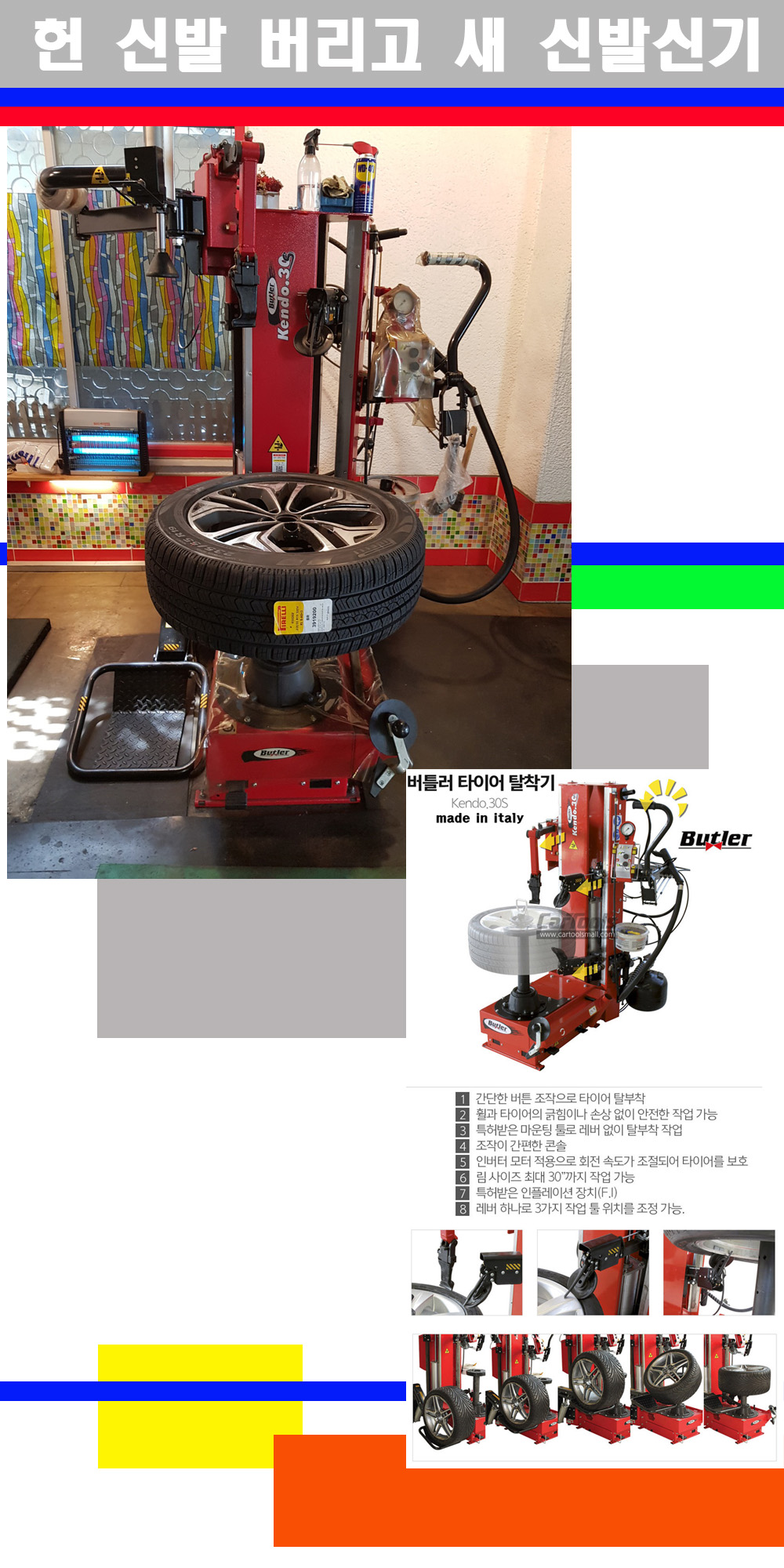 이태리 버틀러사의 켄도3.0S는 휠과 타이어와 조립과 분리시 전혀 제품에 손상을 주지않는 탈착기로 특히 센터락방식(중앙에서 휠를 고정하는 방식)이여서 휠의 중앙부위 잡아서 타이어를 탈부착하고 이후 상하롤러로 타이어를 탈부착합니다 특히 유니포미티작업(휠의 가장가벼운부분과 타이어의 가장 무거운부분을 매칭시키는 작업)시 작업자가 타이어를 정확한 지점에 휠과 매칭시킬수 있는 장점도 있습니다 유니포미티작업 불량시 과도한 진동값으로 핸들링불안 승차감저하 과도한 노면의 충격흡수를 가져와 주행감성을 해치는 첫번째 이유입니다 하지만 이런 작업을 무시하고 그냥 정적인 휠발란스작업만 하는것이 현실입니다 보통 타이어가격만 생각하시고 장착을 하시는데 꼭 이런 부분까지 챙길수 있는 샵을 권장합니다