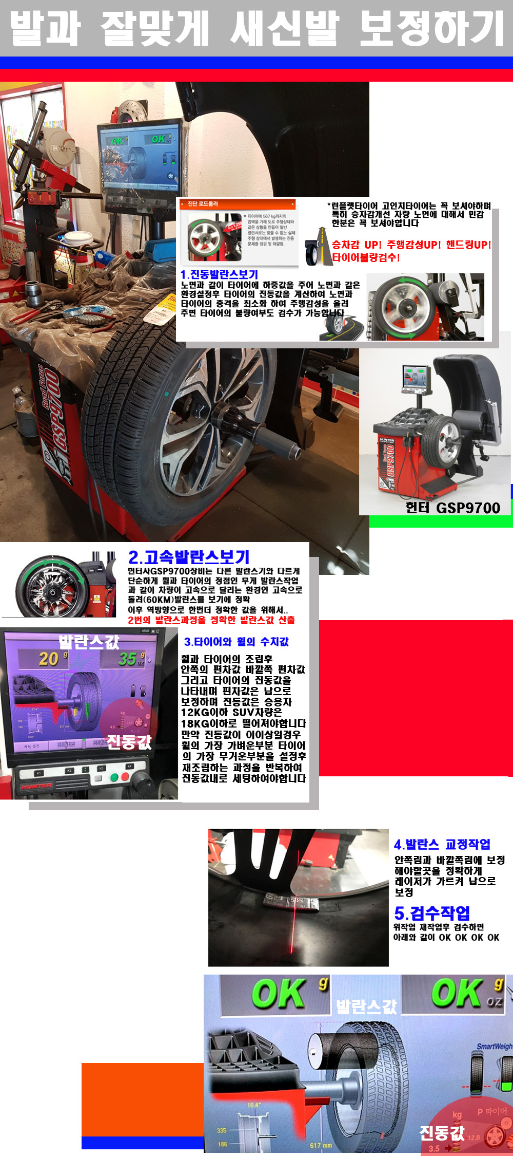 이후 미국 헌터사 GSP9700장비로 고속 및 진동발란스로 더욱더 작업의 정확도와 정밀도를 높였습니다 이장비는 노면에서 올라오는 진동값까지 계산하여 발란스값을 보는 방식으로 진동발란스기는 헌터사GSP9700장비가 유일합니다 이후 역방향으로 60키로의 고속으로 다시 발란스값을 보정하는 방식입니다 그래서 노면에서 올라오는 진동를 잡을수 있으며 특히 타이어의 노면력 측정으로 타이어의 불량여부까지도 검수가 가능한 장비입니다 특히 고속발란스 측정시 타사 발란스기와 틀리게 고속으로 발란스를 보기에 차량이 고속으로 달리는 시뮤레이션 구현이 가능하여 정확한 발란스값을 볼수가 있습니다 그리고 작업자에게는 불필요한 발란스납을 붙이지 않아 미관상으로 좋고 납을 절약하는 고객님에게도윈이고 작업자에게도 윈윈할수 있는 장비입니다 그리고 시중에서 고속진동발란스라고 말하시는 샵들이 많은데 꼭아셔야하는것은 고속발란스는 말그대로 발란스를 볼때 고속으로 돌리기에 60키로 전후 그리고 진동값을 계산하기위해서는 발란스기에 진동롤러가 있어야합니다 그래서 미국헌터사 GSP9700장비가 유일합니다 다른 샵에서 말하는 발란스기는 고속진동발란스기능없는 일반발란스 기기입니다 이점 꼭 아시고 장착하시기를 바랍니다
