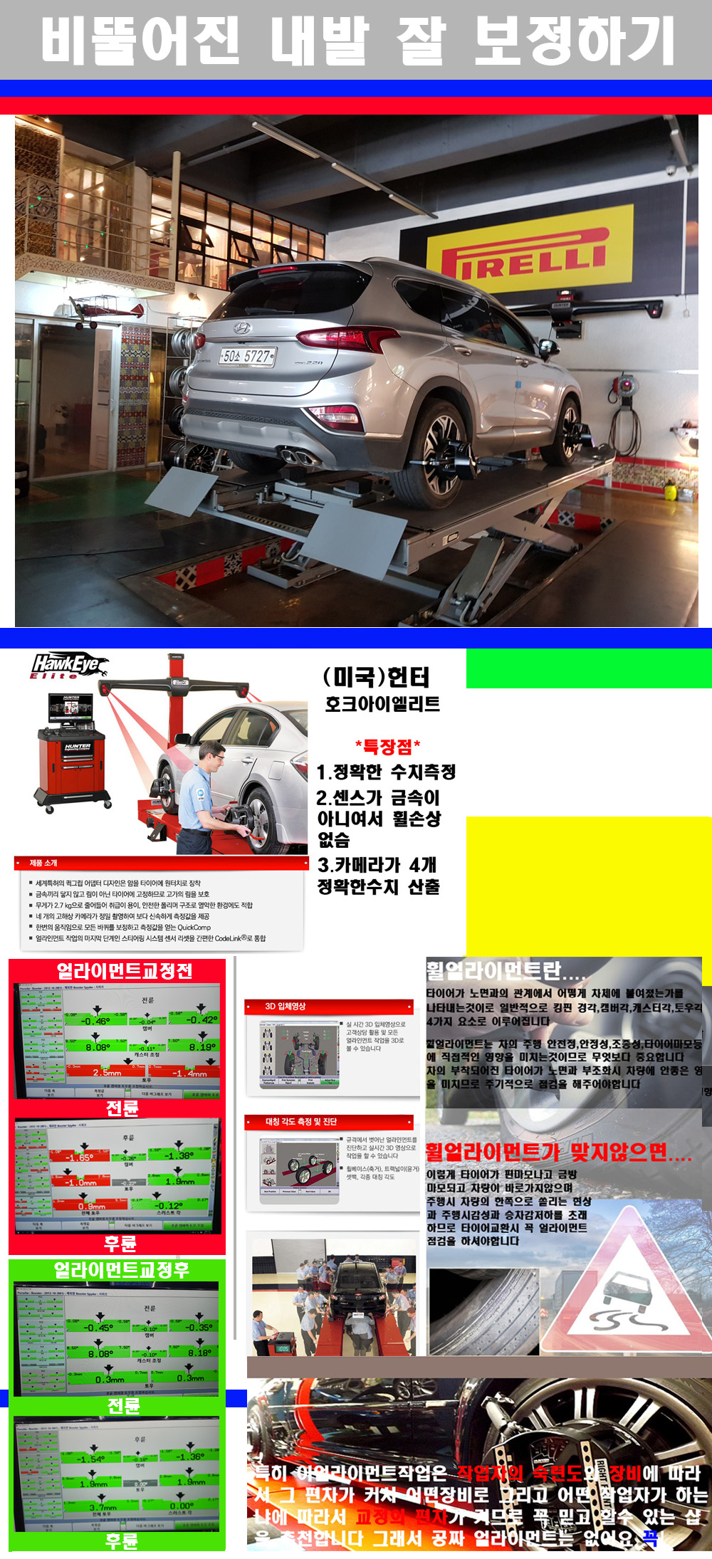 이후 미국 헌터사 호크아이엘리트 장비로 3D얼라이먼트를 진행했습니다 이장비는 현존하는 가장 진화된 얼라이먼트장비입니다 특히 4개의 고성능카메라가 장착되어져 있어 실시간으로 오차가 없는 측정값을 구현하며 바퀴당 각 휠센서 클램프가 프라스틱이며 타이어바닦면을 지지하는 방식이여서 휠의 손상이 없는것이 특징입니다 하지만 장비보다 차량의 얼라이먼트를 볼시 작업자의 정성과 그리고 능력과 숙련도가 관견이기에 꼭 휠얼라이먼트를 장사수단으로 하지않는 샵을 권장합니다 자사는 얼라이먼트정렬시 교정전 교정후를 구분하여 고객님께 직접 이수치값을 확인시켜드리고 작업을 하며 이후 각각의 특성을 가진 타이어들에 대해서 설명 및 관리요령 운전요령 같이 설명해드리고 있습니다 이후 타이어와 휠의 정확한 발란스값과 진동값을 보정후 헌터사 호크아이엘리트 3D얼라이먼트장비로 공장에서 처음 출고될시의 팩토리값으로 교정하였습니다 그리고 타이어질소가스주입기로 3번정도 진공상태로 만든후 질소가스를 주입했습니다 질소가스주입시 가장 관견은 순도이기에 이런 여러번의 진공상태후 주입하고 빼주는 과정를 많이 해주어야합니다 질소가스의 주입시 타이어공기압의 저하가 덜하고 화합물질이 반응을 하지않아 소음전파력과 그리고 타이어안쪽에 수분을 발생하지않으며 타이어안쪽에서의 공기압이 팽창하지않아 타이어에 스트레스를 덜주게 됩니다 하지만 이부분도 공기속에 질소가 80%정도 존재하기에 미미한 차이이지만 질소순도를 높이고 주행시 좋은 점이 확연히 많기에 질소주입을 해드리고 있습니다 특히 고성능타이어나 하중값을 많이 주는 타이어일경우에는 위에서 언급한 부분에서 많이 차이를 보이고 있습니다 이후 타이어왁싱후 출고했습니다+ 감사합니다 |