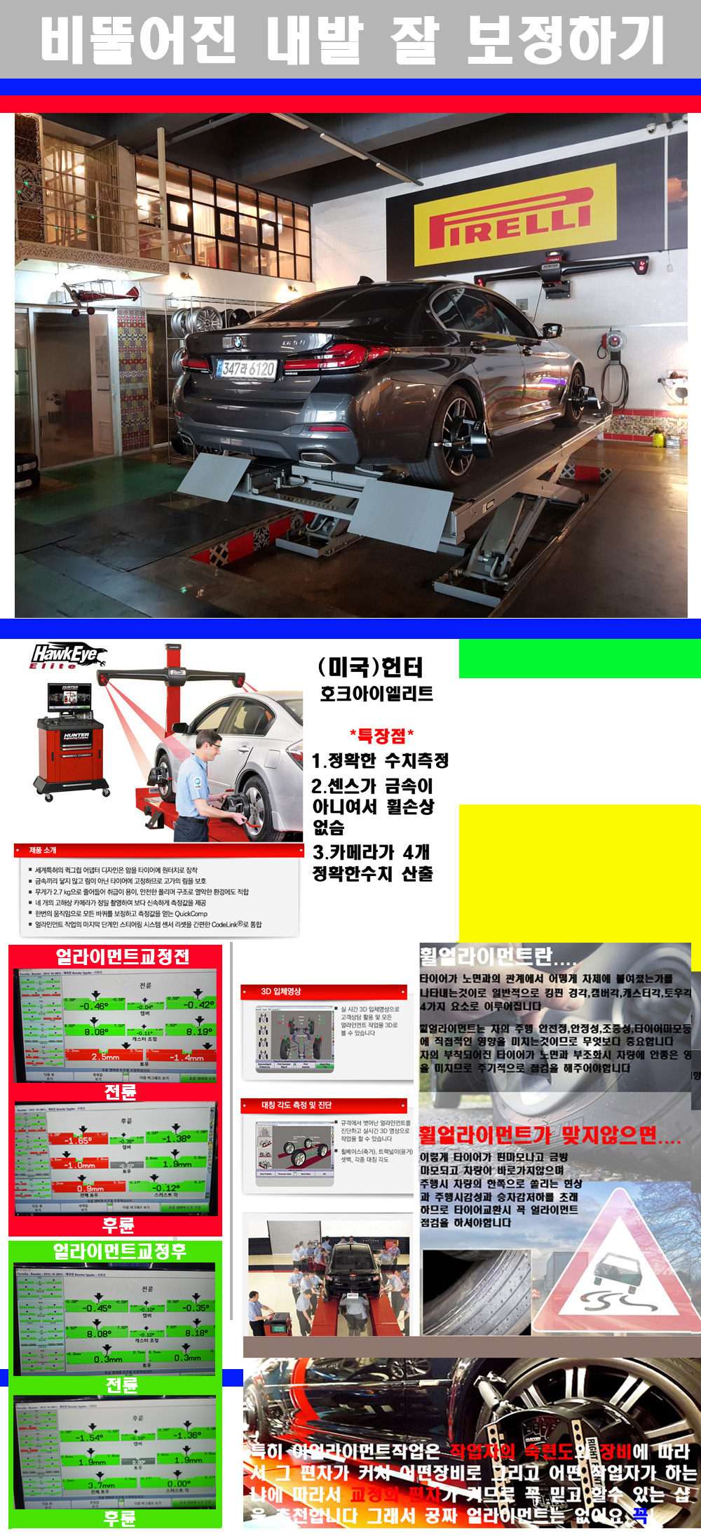 이후 미국 헌터사 호크아이엘리트 장비로 3D얼라이먼트를 진행했습니다 이장비는 현존하는 가장 진화된 얼라이먼트장비입니다 특히 4개의 고성능카메라가 장착되어져 있어 실시간으로 오차가 없는 측정값을 구현하며 바퀴당 각 휠센서 클램프가 프라스틱이며 타이어바닦면을 지지하는 방식이여서 휠의 손상이 없는것이 특징입니다 하지만 장비보다 차량의 얼라이먼트를 볼시 작업자의 정성과 그리고 능력과 숙련도가 관견이기에 꼭 휠얼라이먼트를 장사수단으로 하지않는 샵을 권장합니다 자사는 얼라이먼트정렬시 교정전 교정후를 구분하여 고객님께 직접 이수치값을 확인시켜드리고 작업을 하며 이후 각각의 특성을 가진 타이어들에 대해서 설명 및 관리요령 운전요령 같이 설명해드리고 있습니다 이후 타이어와 휠의 정확한 발란스값과 진동값을 보정후 헌터사 호크아이엘리트 3D얼라이먼트장비로 공장에서 처음 출고될시의 팩토리값으로 교정하였습니다 그리고 타이어질소가스주입기로 3번정도 진공상태로 만든후 질소가스를 주입했습니다 질소가스주입시 가장 관견은 순도이기에 이런 여러번의 진공상태후 주입하고 빼주는 과정를 많이 해주어야합니다 질소가스의 주입시 타이어공기압의 저하가 덜하고 화합물질이 반응을 하지않아 소음전파력과 그리고 타이어안쪽에 수분을 발생하지않으며 타이어안쪽에서의 공기압이 팽창하지않아 타이어에 스트레스를 덜주게 됩니다 하지만 이부분도 공기속에 질소가 80%정도 존재하기에 미미한 차이이지만 질소순도를 높이고 주행시 좋은 점이 확연히 많기에 질소주입을 해드리고 있습니다 특히 고성능타이어나 하중값을 많이 주는 타이어일경우에는 위에서 언급한 부분에서 많이 차이를 보이고 있습니다 이후 타이어왁싱후 출고했습니다+ 감사합니다 |