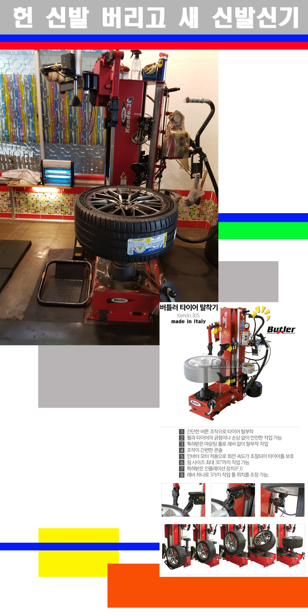 이태리 버틀러사의 켄도3.0S는 휠과 타이어와 조립과 분리시 전혀 제품에 손상을 주지않는 탈착기로 특히 센터락방식(중앙에서 휠를 고정하는 방식)이여서 휠의 중앙부위 잡아서 타이어를 탈부착하고 이후 상하롤러로 타이어를 탈부착합니다 특히 유니포미티작업(휠의 가장가벼운부분과 타이어의 가장 무거운부분을 매칭시키는 작업)시 작업자가 타이어를 정확한 지점에 휠과 매칭시킬수 있는 장점도 있습니다 유니포미티작업 불량시 과도한 진동값으로 핸들링불안 승차감저하 과도한 노면의 충격흡수를 가져와 주행감성을 해치는 첫번째 이유입니다 하지만 이런 작업을 무시하고 그냥 정적인 휠발란스작업만 하는것이 현실입니다 보통 타이어가격만 생각하시고 장착을 하시는데 꼭 이런 부분까지 챙길수 있는 샵을 권장합니다
