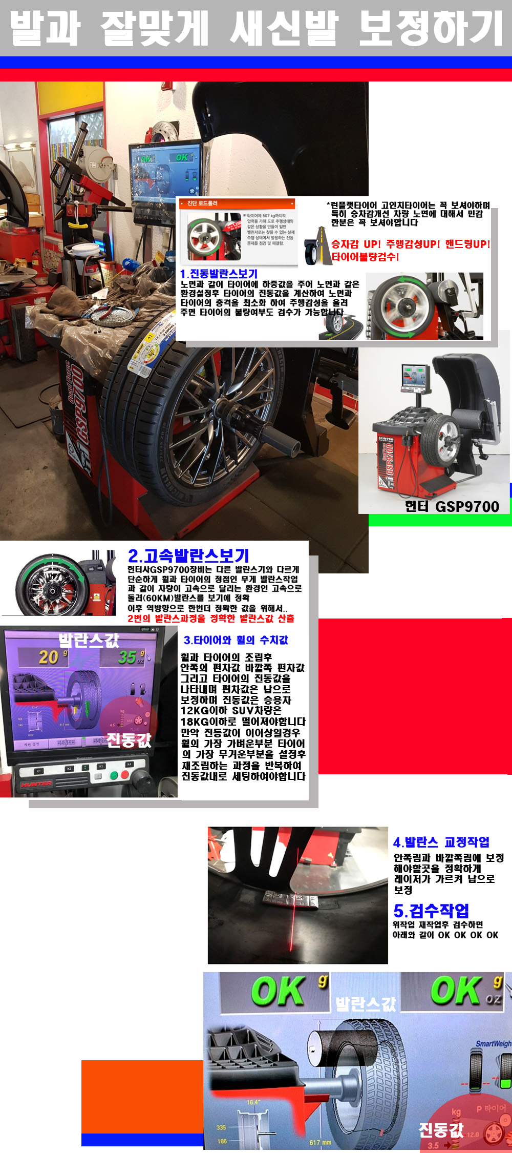이후 미국 헌터사 GSP9700장비로 고속 및 진동발란스로 더욱더 작업의 정확도와 정밀도를 높였습니다 이장비는 노면에서 올라오는 진동값까지 계산하여 발란스값을 보는 방식으로 진동발란스기는 헌터사GSP9700장비가 유일합니다 이후 역방향으로 60키로의 고속으로 다시 발란스값을 보정하는 방식입니다 그래서 노면에서 올라오는 진동를 잡을수 있으며 특히 타이어의 노면력 측정으로 타이어의 불량여부까지도 검수가 가능한 장비입니다 특히 고속발란스 측정시 타사 발란스기와 틀리게 고속으로 발란스를 보기에 차량이 고속으로 달리는 시뮤레이션 구현이 가능하여 정확한 발란스값을 볼수가 있습니다 그리고 작업자에게는 불필요한 발란스납을 붙이지 않아 미관상으로 좋고 납을 절약하는 고객님에게도윈이고 작업자에게도 윈윈할수 있는 장비입니다 그리고 시중에서 고속진동발란스라고 말하시는 샵들이 많은데 꼭아셔야하는것은 고속발란스는 말그대로 발란스를 볼때 고속으로 돌리기에 60키로 전후 그리고 진동값을 계산하기위해서는 발란스기에 진동롤러가 있어야합니다 그래서 미국헌터사 GSP9700장비가 유일합니다 다른 샵에서 말하는 발란스기는 고속진동발란스기능없는 일반발란스 기기입니다 이점 꼭 아시고 장착하시기를 바랍니다