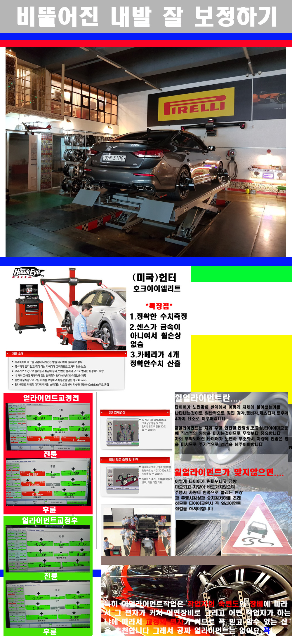 이후 미국 헌터사 호크아이엘리트 장비로 3D얼라이먼트를 진행했습니다 이장비는 현존하는 가장 진화된 얼라이먼트장비입니다 특히 4개의 고성능카메라가 장착되어져 있어 실시간으로 오차가 없는 측정값을 구현하며 바퀴당 각 휠센서 클램프가 프라스틱이며 타이어바닦면을 지지하는 방식이여서 휠의 손상이 없는것이 특징입니다 하지만 장비보다 차량의 얼라이먼트를 볼시 작업자의 정성과 그리고 능력과 숙련도가 관견이기에 꼭 휠얼라이먼트를 장사수단으로 하지않는 샵을 권장합니다 자사는 얼라이먼트정렬시 교정전 교정후를 구분하여 고객님께 직접 이수치값을 확인시켜드리고 작업을 하며 이후 각각의 특성을 가진 타이어들에 대해서 설명 및 관리요령 운전요령 같이 설명해드리고 있습니다 이후 타이어와 휠의 정확한 발란스값과 진동값을 보정후 헌터사 호크아이엘리트 3D얼라이먼트장비로 공장에서 처음 출고될시의 팩토리값으로 교정하였습니다 그리고 타이어질소가스주입기로 3번정도 진공상태로 만든후 질소가스를 주입했습니다 질소가스주입시 가장 관견은 순도이기에 이런 여러번의 진공상태후 주입하고 빼주는 과정를 많이 해주어야합니다 질소가스의 주입시 타이어공기압의 저하가 덜하고 화합물질이 반응을 하지않아 소음전파력과 그리고 타이어안쪽에 수분을 발생하지않으며 타이어안쪽에서의 공기압이 팽창하지않아 타이어에 스트레스를 덜주게 됩니다 하지만 이부분도 공기속에 질소가 80%정도 존재하기에 미미한 차이이지만 질소순도를 높이고 주행시 좋은 점이 확연히 많기에 질소주입을 해드리고 있습니다 특히 고성능타이어나 하중값을 많이 주는 타이어일경우에는 위에서 언급한 부분에서 많이 차이를 보이고 있습니다 이후 타이어왁싱후 출고했습니다+ 감사합니다 |