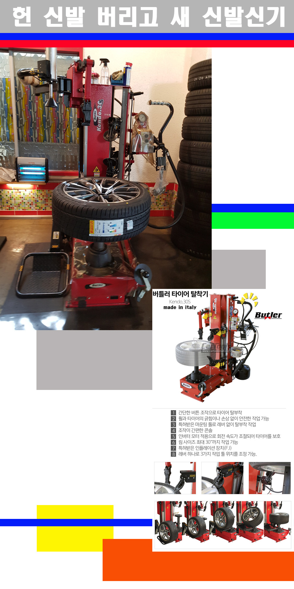 이태리 버틀러사의 켄도3.0S는 휠과 타이어와 조립과 분리시 전혀 제품에 손상을 주지않는 탈착기로 특히 센터락방식(중앙에서 휠를 고정하는 방식)이여서 휠의 중앙부위 잡아서 타이어를 탈부착하고 이후 상하롤러로 타이어를 탈부착합니다 특히 유니포미티작업(휠의 가장가벼운부분과 타이어의 가장 무거운부분을 매칭시키는 작업)시 작업자가 타이어를 정확한 지점에 휠과 매칭시킬수 있는 장점도 있습니다 유니포미티작업 불량시 과도한 진동값으로 핸들링불안 승차감저하 과도한 노면의 충격흡수를 가져와 주행감성을 해치는 첫번째 이유입니다 하지만 이런 작업을 무시하고 그냥 정적인 휠발란스작업만 하는것이 현실입니다 보통 타이어가격만 생각하시고 장착을 하시는데 꼭 이런 부분까지 챙길수 있는 샵을 권장합니다