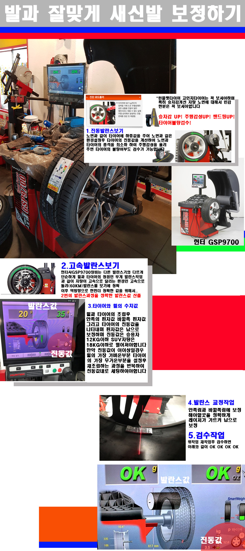 이후 미국 헌터사 GSP9700장비로 고속 및 진동발란스로 더욱더 작업의 정확도와 정밀도를 높였습니다 이장비는 노면에서 올라오는 진동값까지 계산하여 발란스값을 보는 방식으로 진동발란스기는 헌터사GSP9700장비가 유일합니다 이후 역방향으로 60키로의 고속으로 다시 발란스값을 보정하는 방식입니다 그래서 노면에서 올라오는 진동를 잡을수 있으며 특히 타이어의 노면력 측정으로 타이어의 불량여부까지도 검수가 가능한 장비입니다 특히 고속발란스 측정시 타사 발란스기와 틀리게 고속으로 발란스를 보기에 차량이 고속으로 달리는 시뮤레이션 구현이 가능하여 정확한 발란스값을 볼수가 있습니다 그리고 작업자에게는 불필요한 발란스납을 붙이지 않아 미관상으로 좋고 납을 절약하는 고객님에게도윈이고 작업자에게도 윈윈할수 있는 장비입니다 그리고 시중에서 고속진동발란스라고 말하시는 샵들이 많은데 꼭아셔야하는것은 고속발란스는 말그대로 발란스를 볼때 고속으로 돌리기에 60키로 전후 그리고 진동값을 계산하기위해서는 발란스기에 진동롤러가 있어야합니다 그래서 미국헌터사 GSP9700장비가 유일합니다 다른 샵에서 말하는 발란스기는 고속진동발란스기능없는 일반발란스 기기입니다 이점 꼭 아시고 장착하시기를 바랍니다