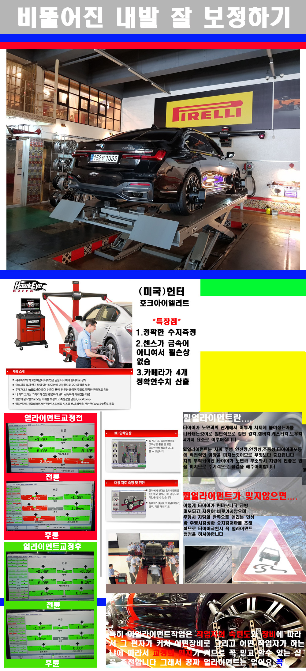 이후 미국 헌터사 호크아이엘리트 장비로 3D얼라이먼트를 진행했습니다 이장비는 현존하는 가장 진화된 얼라이먼트장비입니다 특히 4개의 고성능카메라가 장착되어져 있어 실시간으로 오차가 없는 측정값을 구현하며 바퀴당 각 휠센서 클램프가 프라스틱이며 타이어바닦면을 지지하는 방식이여서 휠의 손상이 없는것이 특징입니다 하지만 장비보다 차량의 얼라이먼트를 볼시 작업자의 정성과 그리고 능력과 숙련도가 관견이기에 꼭 휠얼라이먼트를 장사수단으로 하지않는 샵을 권장합니다 자사는 얼라이먼트정렬시 교정전 교정후를 구분하여 고객님께 직접 이수치값을 확인시켜드리고 작업을 하며 이후 각각의 특성을 가진 타이어들에 대해서 설명 및 관리요령 운전요령 같이 설명해드리고 있습니다 이후 타이어와 휠의 정확한 발란스값과 진동값을 보정후 헌터사 호크아이엘리트 3D얼라이먼트장비로 공장에서 처음 출고될시의 팩토리값으로 교정하였습니다 그리고 타이어질소가스주입기로 3번정도 진공상태로 만든후 질소가스를 주입했습니다 질소가스주입시 가장 관견은 순도이기에 이런 여러번의 진공상태후 주입하고 빼주는 과정를 많이 해주어야합니다 질소가스의 주입시 타이어공기압의 저하가 덜하고 화합물질이 반응을 하지않아 소음전파력과 그리고 타이어안쪽에 수분을 발생하지않으며 타이어안쪽에서의 공기압이 팽창하지않아 타이어에 스트레스를 덜주게 됩니다 하지만 이부분도 공기속에 질소가 80%정도 존재하기에 미미한 차이이지만 질소순도를 높이고 주행시 좋은 점이 확연히 많기에 질소주입을 해드리고 있습니다 특히 고성능타이어나 하중값을 많이 주는 타이어일경우에는 위에서 언급한 부분에서 많이 차이를 보이고 있습니다 이후 타이어왁싱후 출고했습니다+ 감사합니다 |