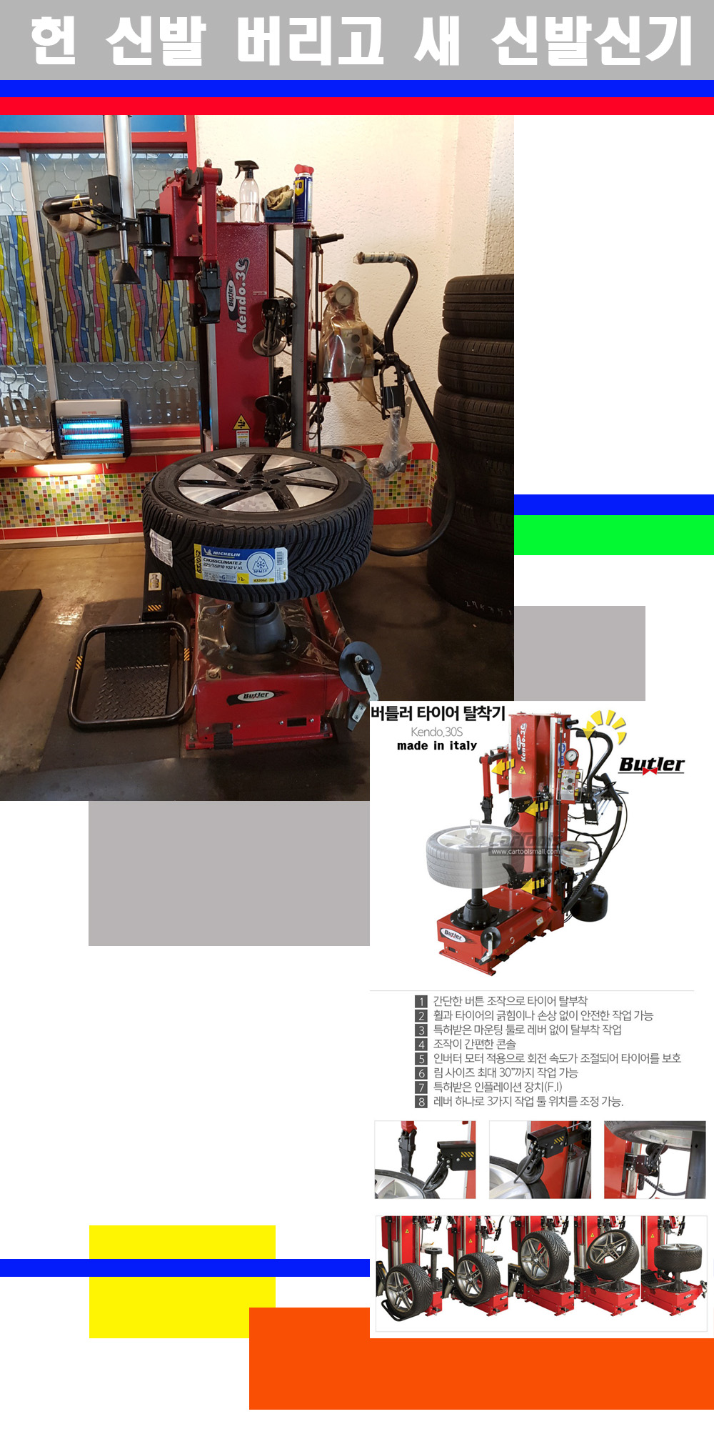 이태리 버틀러사의 켄도3.0S는 휠과 타이어와 조립과 분리시 전혀 제품에 손상을 주지않는 탈착기로 특히 센터락방식(중앙에서 휠를 고정하는 방식)이여서 휠의 중앙부위 잡아서 타이어를 탈부착하고 이후 상하롤러로 타이어를 탈부착합니다 특히 유니포미티작업(휠의 가장가벼운부분과 타이어의 가장 무거운부분을 매칭시키는 작업)시 작업자가 타이어를 정확한 지점에 휠과 매칭시킬수 있는 장점도 있습니다 유니포미티작업 불량시 과도한 진동값으로 핸들링불안 승차감저하 과도한 노면의 충격흡수를 가져와 주행감성을 해치는 첫번째 이유입니다 하지만 이런 작업을 무시하고 그냥 정적인 휠발란스작업만 하는것이 현실입니다 보통 타이어가격만 생각하시고 장착을 하시는데 꼭 이런 부분까지 챙길수 있는 샵을 권장합니다